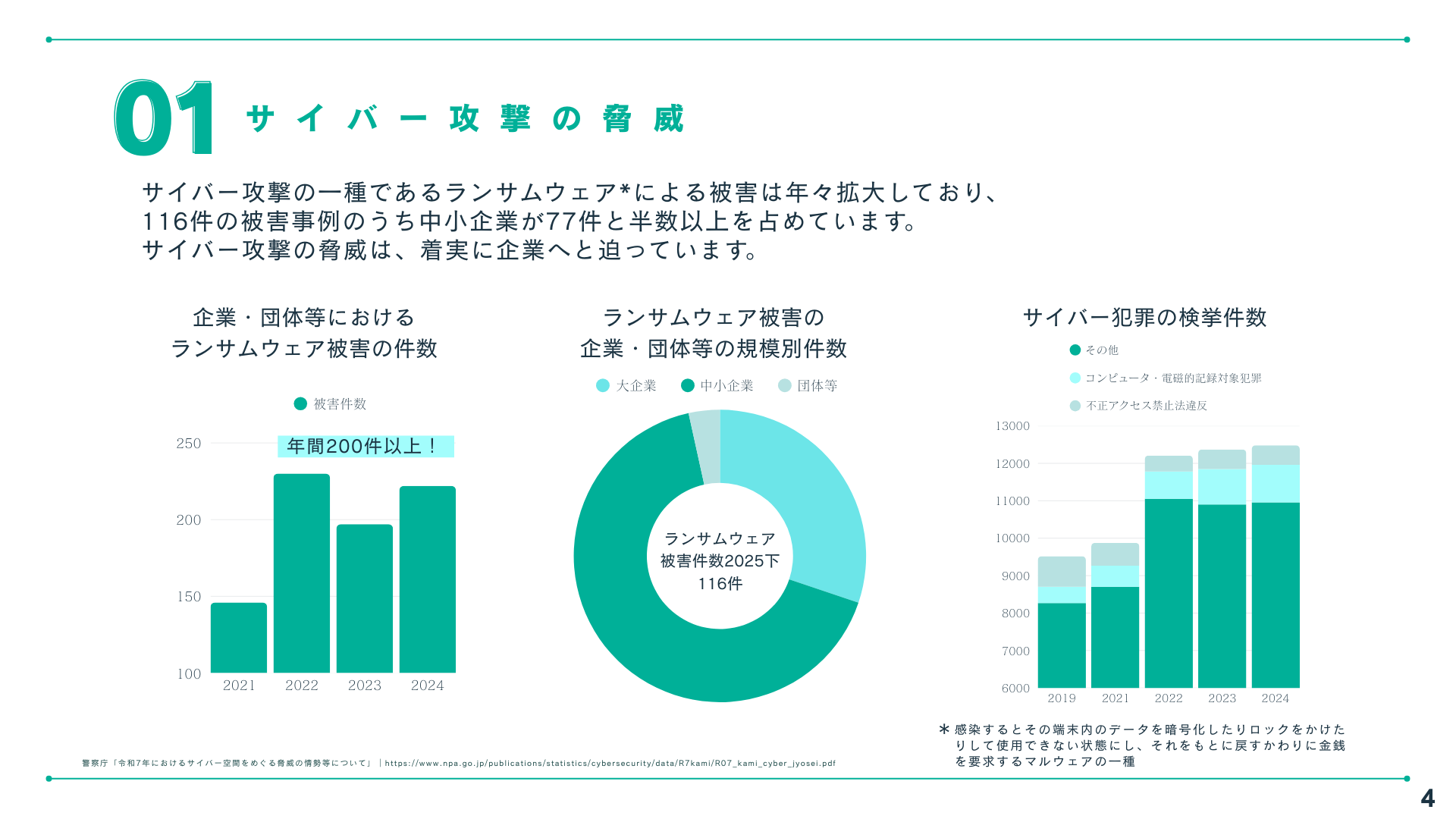 近年、ランサムウェアをはじめとするサイバー攻撃が後を絶たず、取引先1社の被害がサプライチェーン全体へ波及する事例も報告されています(※1)。