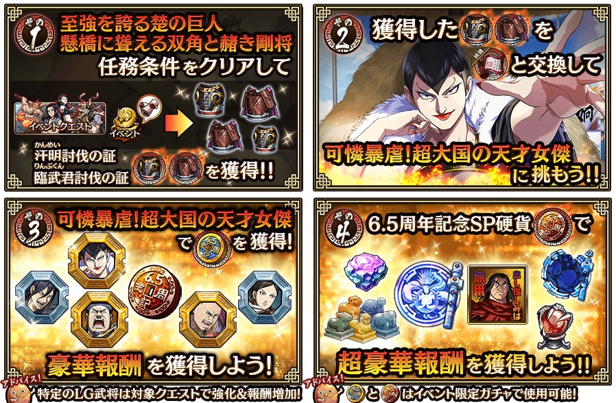 一部のLG趙軍武将でイベントクエストをクリアすると、追加で『6.5周年記念硬貨』を獲得できます!