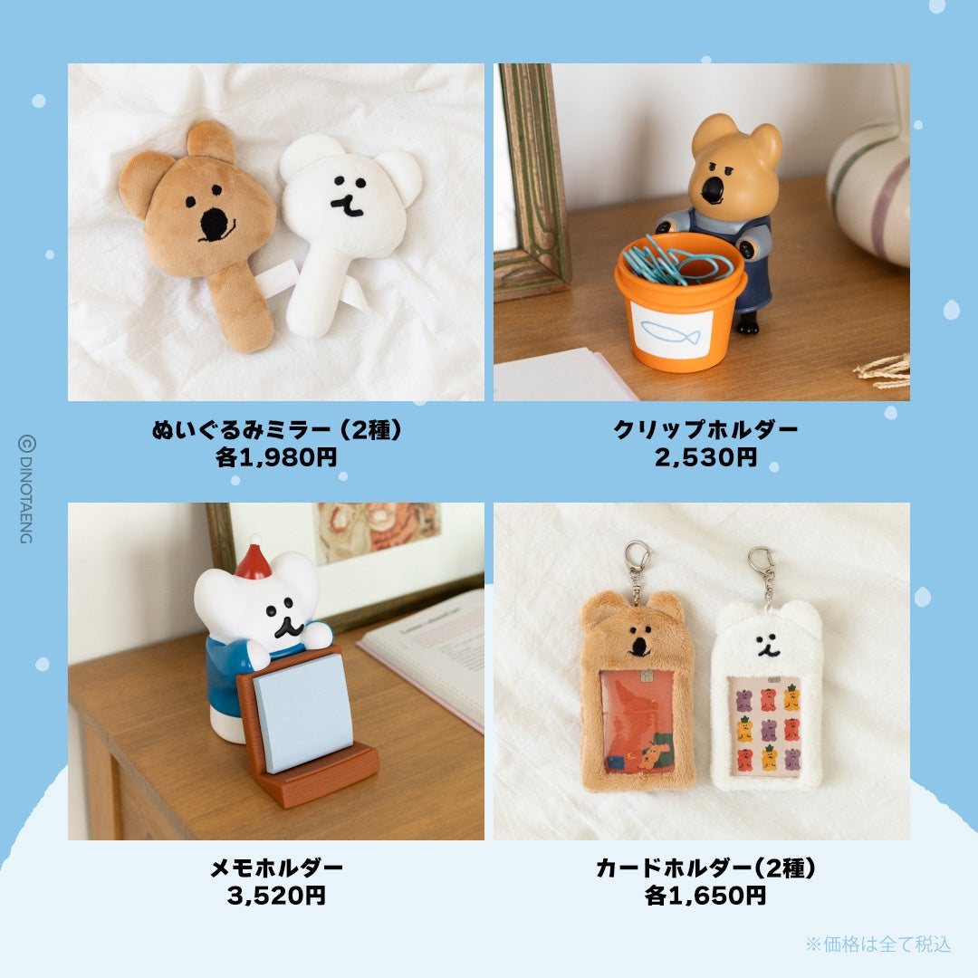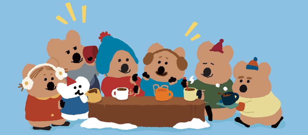 クオッカたちがココアを手に持ちポーズをとっているフィギュア、そりのキーリング、シリコンのケーブルタイ、その他にも文房具やリビング、キッチンアイテム、もふもふ素材の抱き枕やルームソックス、ひざ掛け、スリッパ、冬のぬくもりをたっぷり詰め込んだ新作アイテムを取り揃えています。