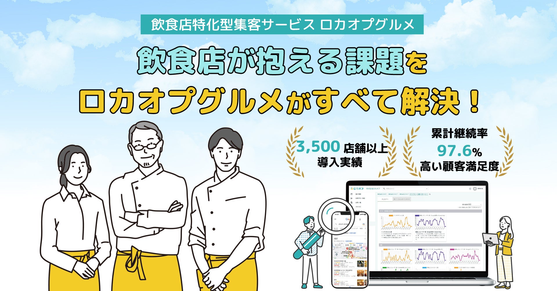Googleマップ(MEO)対策を中心に、集客から来店・リピートまで店舗運営に関するさまざまな課題を解決するツール「ロカオプ」を軸に、インバウンド対策やグルメサイト一元管理など飲食店特有のお悩みをワンストップで解決するサービスとなっています。