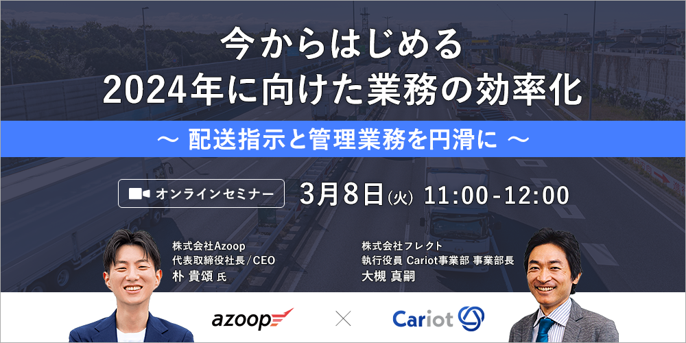 株式会社フレクト(本社:東京都千代田区、代表取締役CEO:黒川 幸治、以下フレクト)は、株式会社Azoop(本社:東京都港区、代表取締役:朴 貴頌、以下Azoop)との合同で、オンラインセミナー「今からはじめる2024年に向けた業務の効率化〜配送指示と管理業務を円滑に〜」を2022年3月8日(火)に開催します。このセミナーでは主に運送業に関わる方を対象に、サービスの紹介から実際の事例を交えてご紹介します。