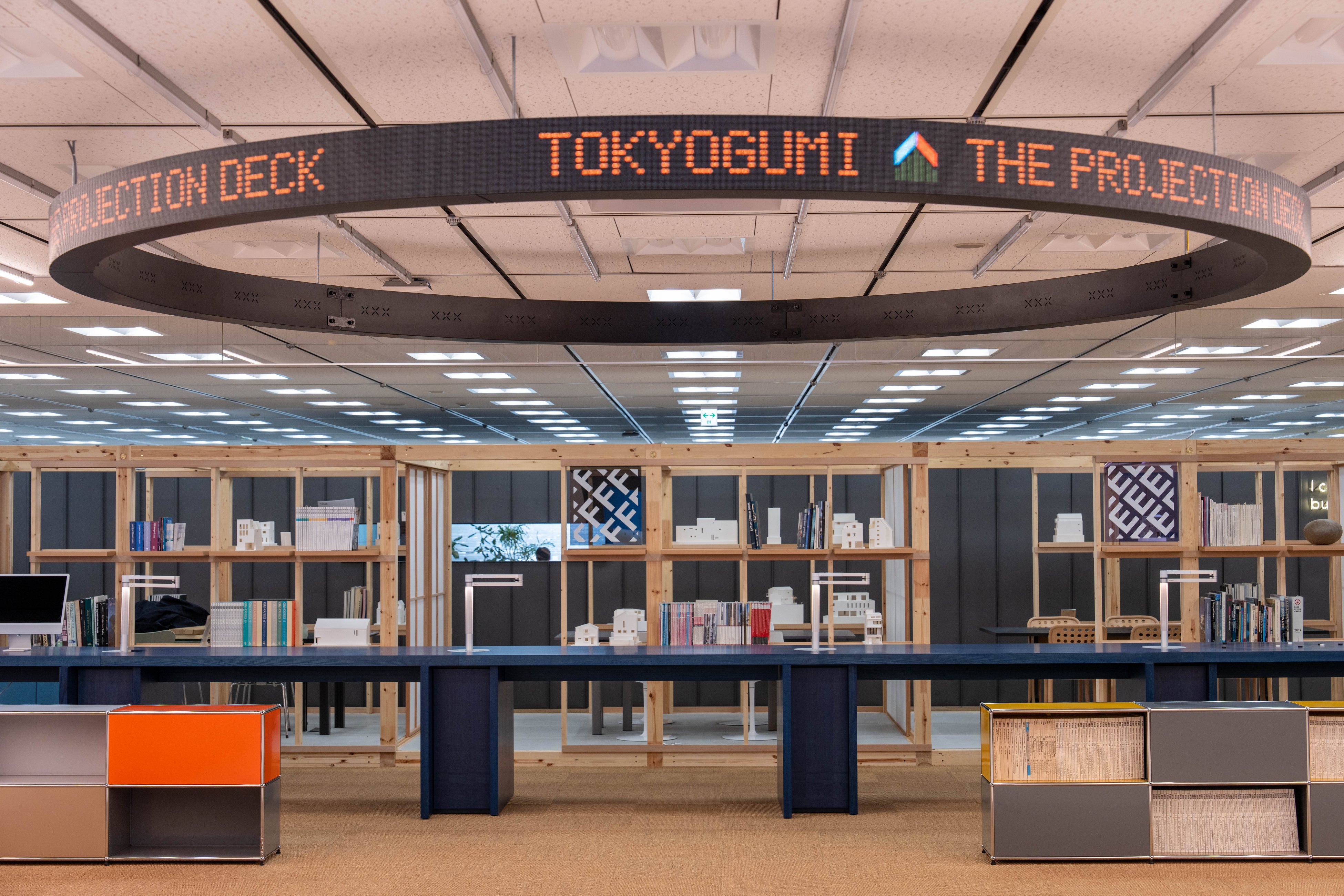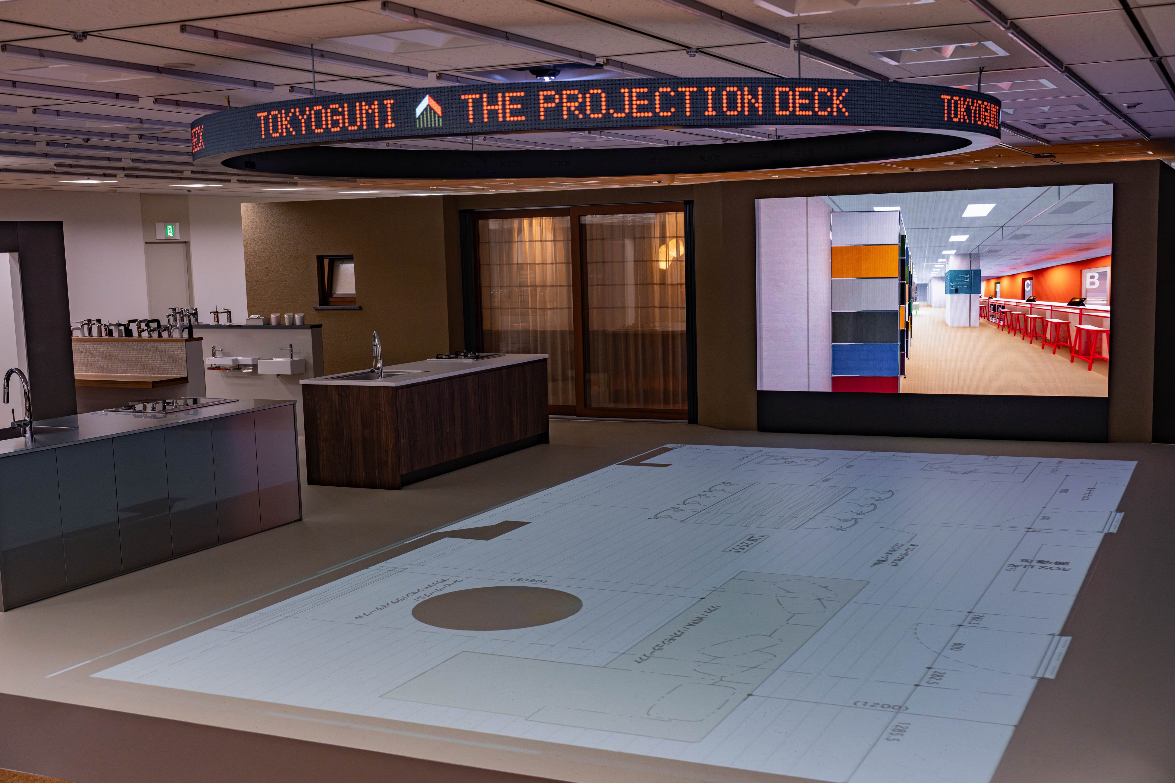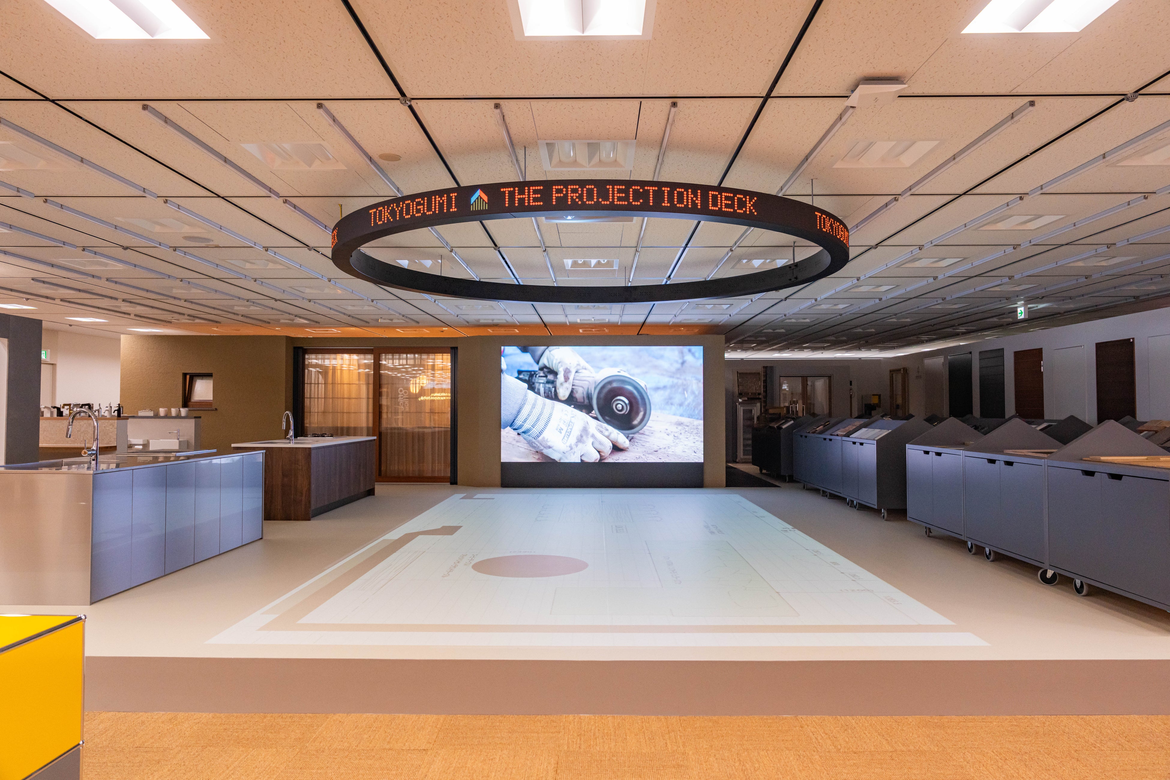 映像による展示空間と実寸大の間取りを床に投影して体験できる「プロジェクションデッキ」を中心に、住空間を想定したモデルルームとスタジオ、厳選された素材を揃えたパーツライブラリーで構成されています。