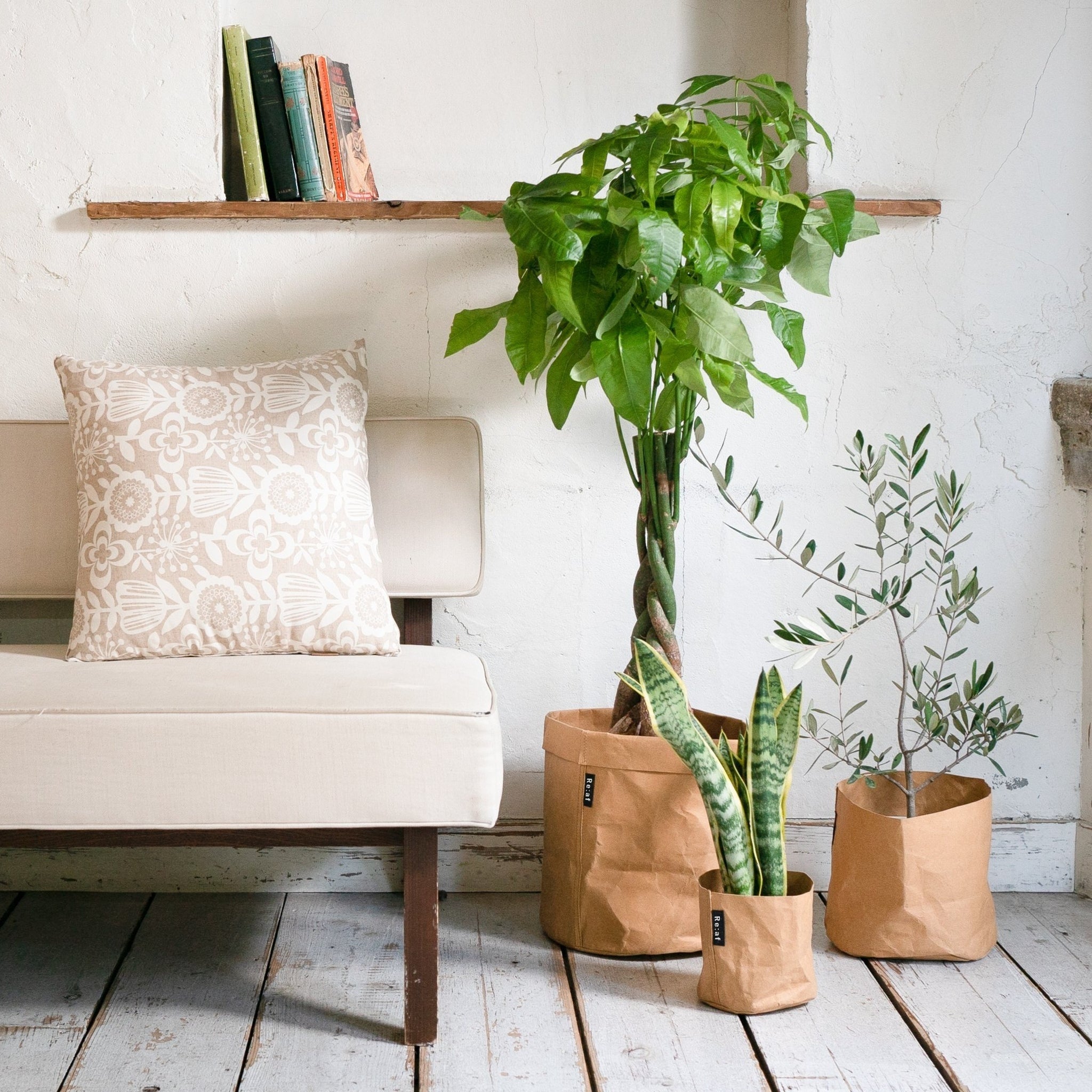 水にも強く耐久性も備えており、また、レザーのような風合いの素材感のあるテクスチャーで、お部屋にも合わせやすい鉢カバーです。