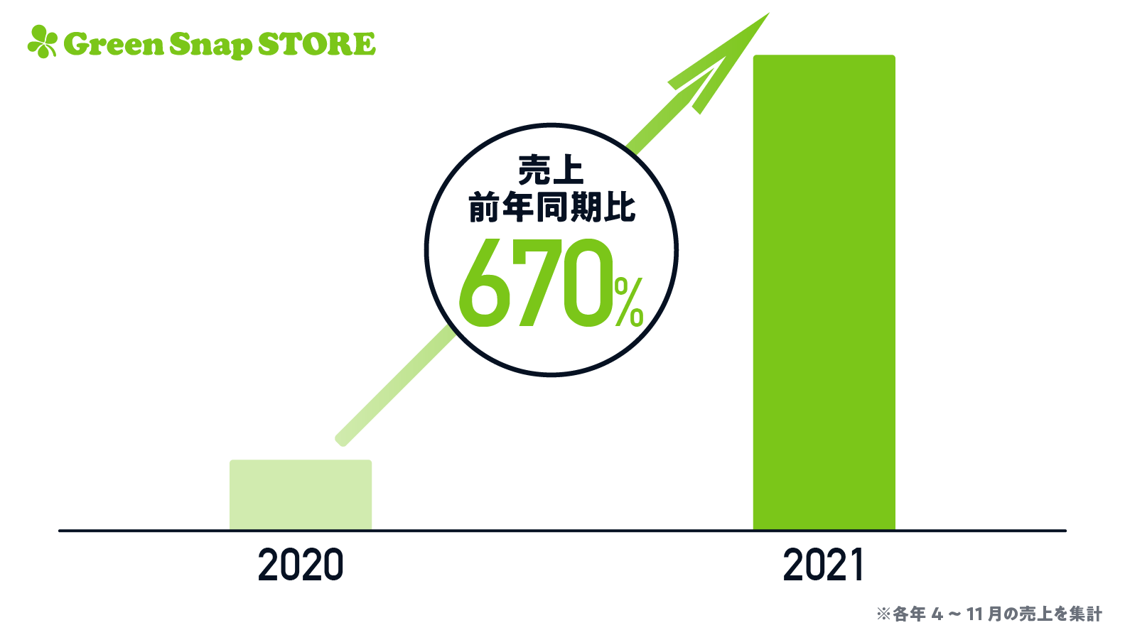 2020年4月からスタートしたGreenSnap STOREは、GreenSnapアプリ利用者のみならず、植物に興味・関心を寄せる多くの方にご利用いただき、2021年4月~11月の売上が前年同時期の売上と比較し670%の大幅成長をいたしました。