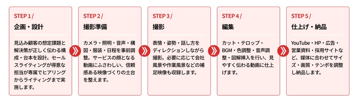 企画・設計からキックオフヒアリング、撮影、編集を経て、お申し込みから最短1ヶ月での納品を目指しています。まずはお気軽に無料相談からご連絡ください。