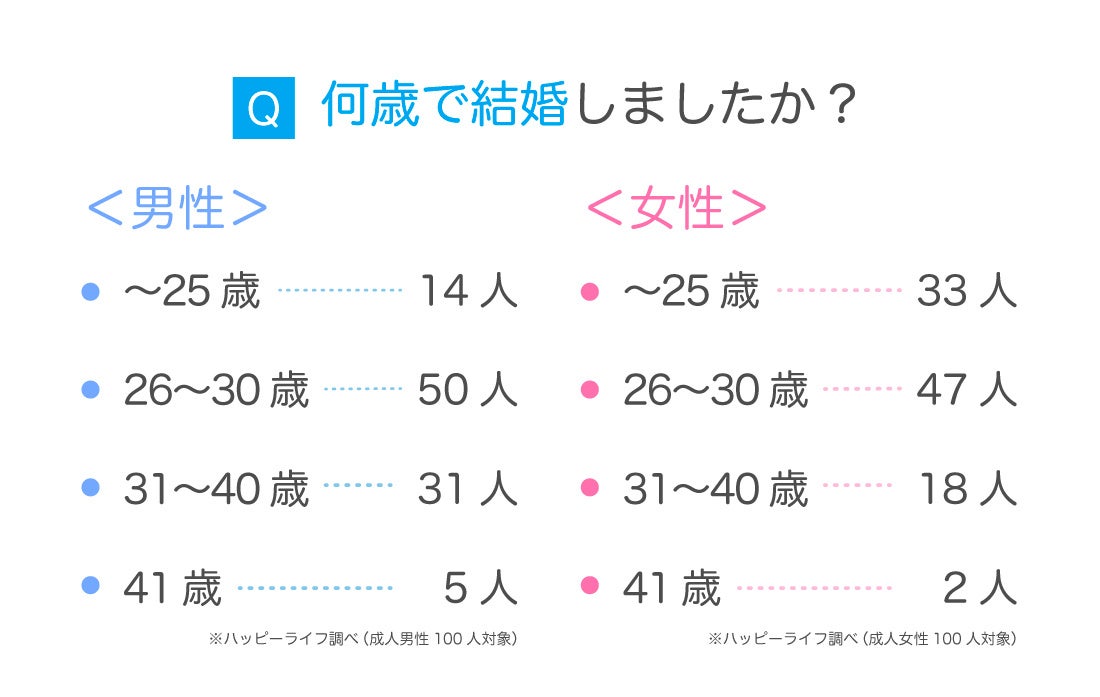 成人男女200人に調査したところ、男女ともに半数の人が「26〜30歳」で結婚しているそうです。