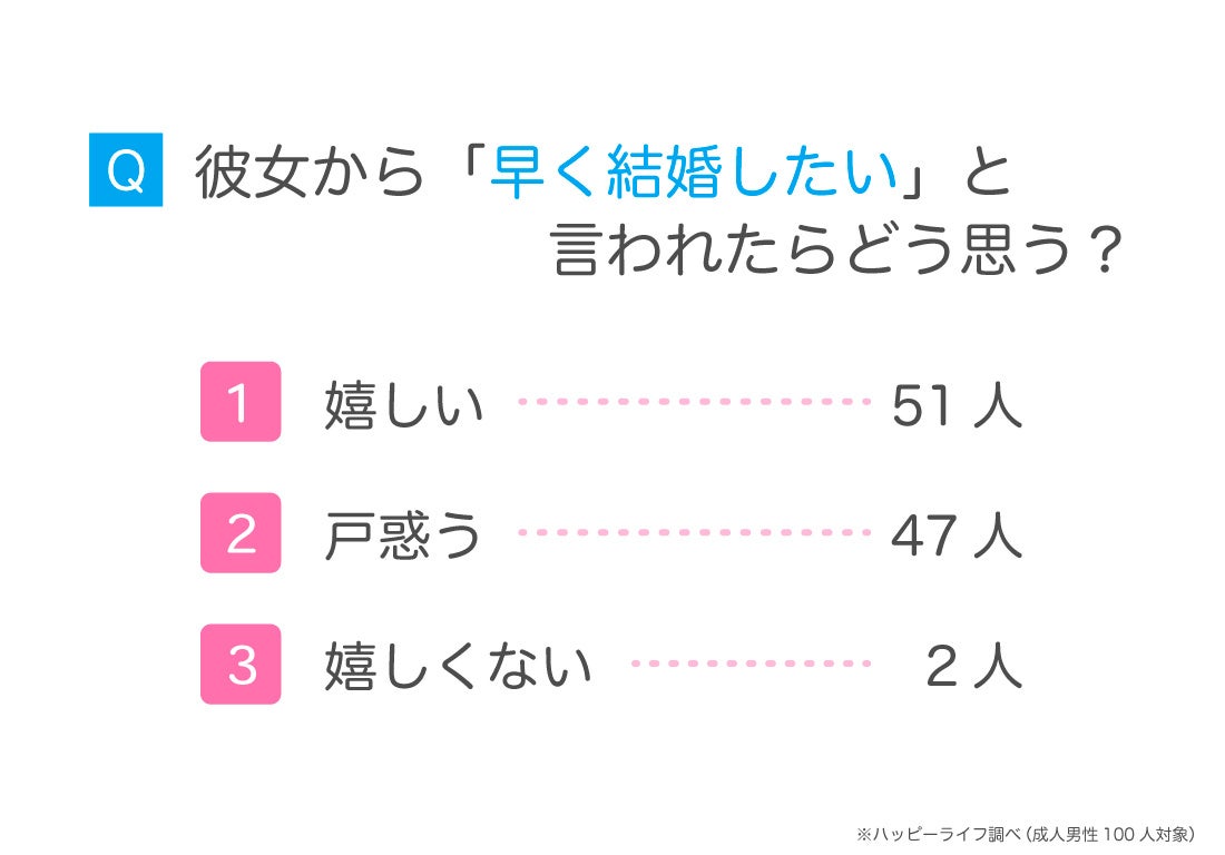 彼女から「早く結婚したい」と言われたら半数の男性が「嬉しい」と思うようですが、一方で戸惑いを隠せない男性も存在します。