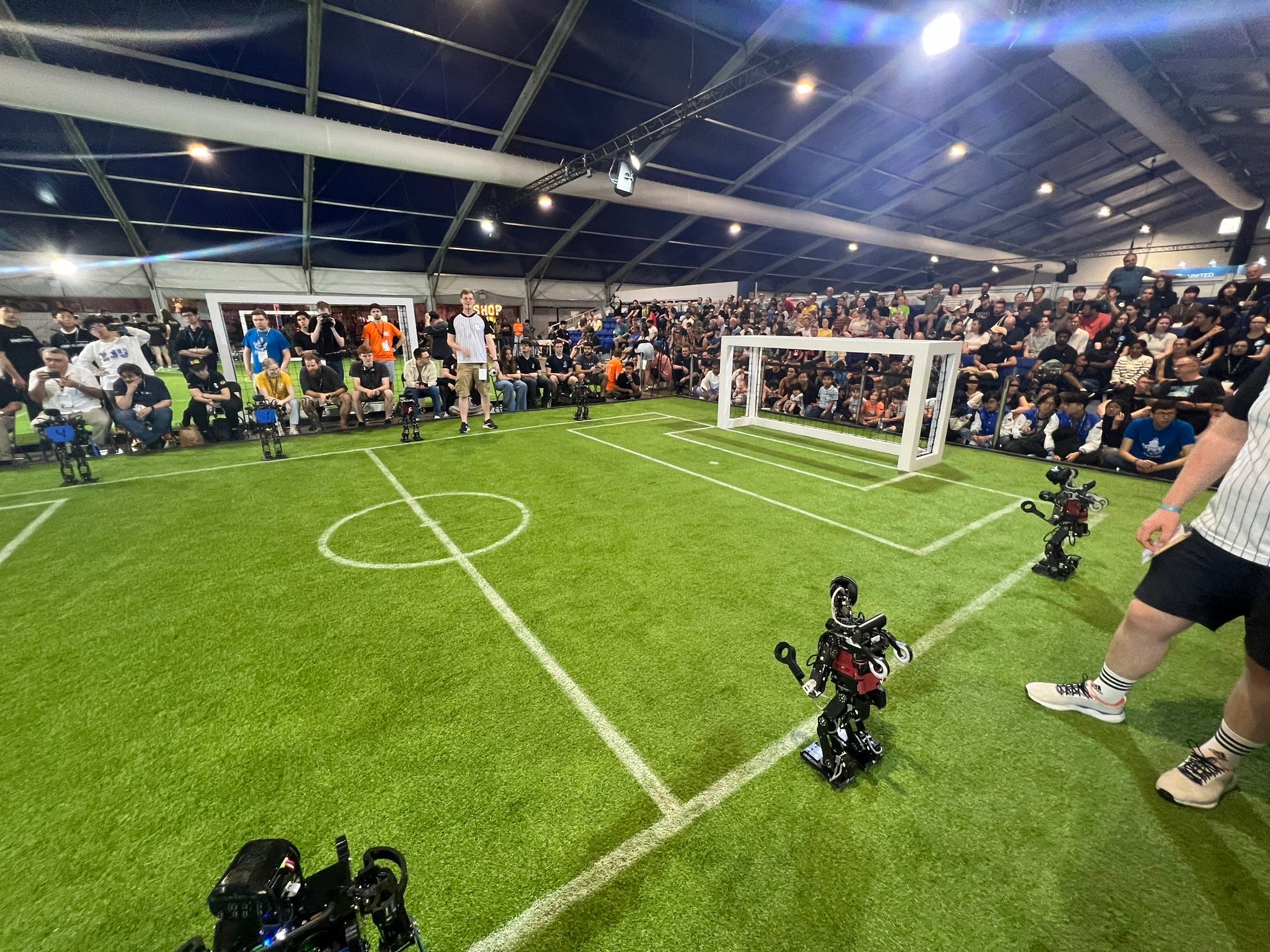 ロボカップは、「2050年までにサッカーW杯チャンピオンに勝つ自律型のヒューマノイドロボットを作る」という目標を掲げて1992年に国際委員会がスタートしました。第1回世界大会は1997年に名古屋市で開催されて以降、コロナ禍の影響でオンライン開催となった2021年と2022年のバーチャル大会を除いて、毎年世界各地でロボットの実機を使って開催されています。