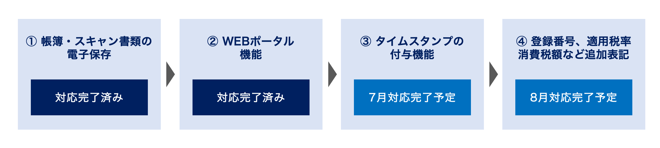 インボイス制度及び電子帳簿保存法の影響を受ける業務に関し、smetaクラウドにおいては、下記のステップにて順次対応を進めて参ります。