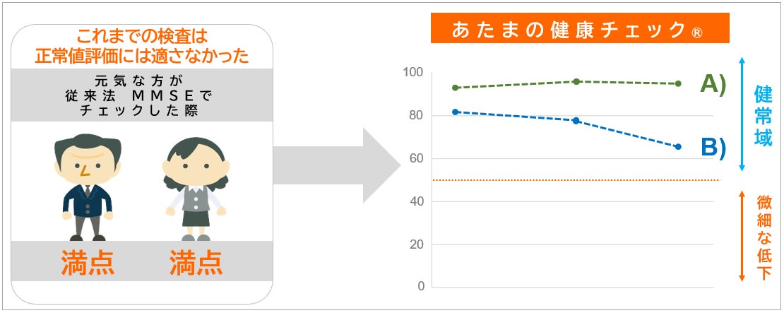 あたまの健康チェック®は、従来検査法では天井効果により安定評価の難しかった「健常域」における正常値の経時変化観察が可能な初めての認知機能スケールです。