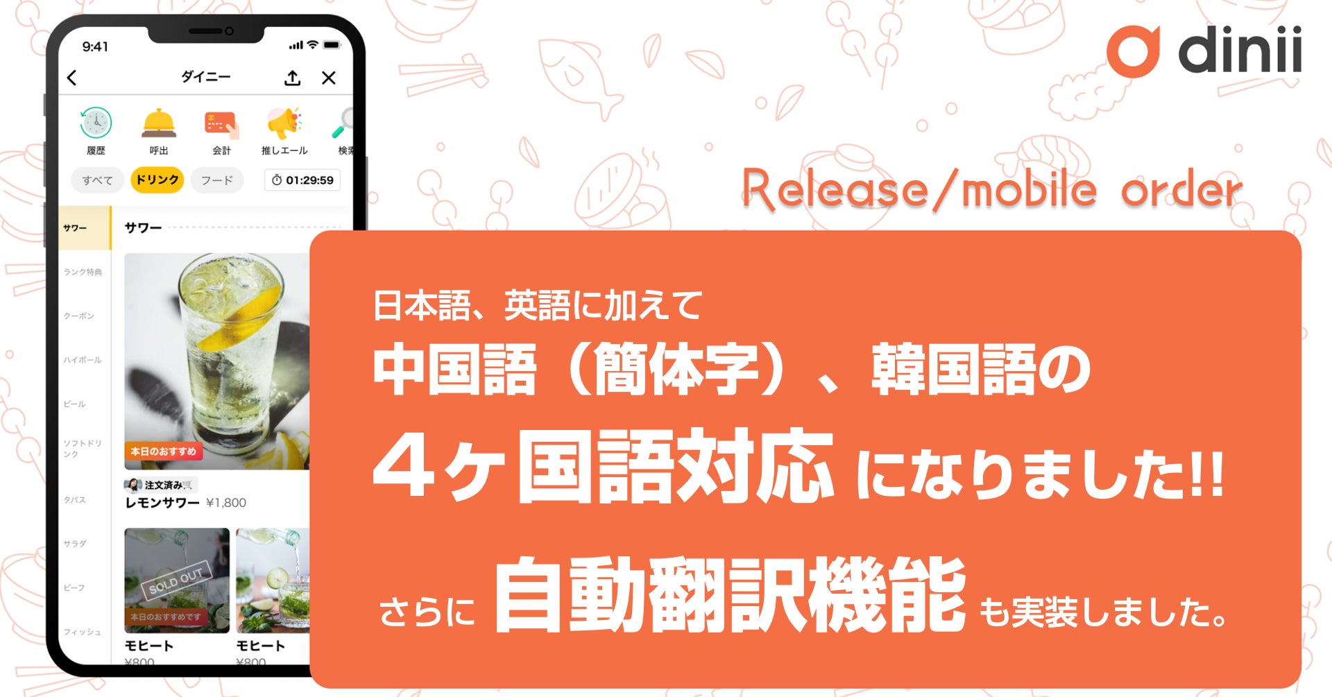 モバイルオーダーの翻訳機能に「中国語(簡体字)」「韓国語」を追加、4カ国対応に!!また「自動翻訳」機能をリリース!!