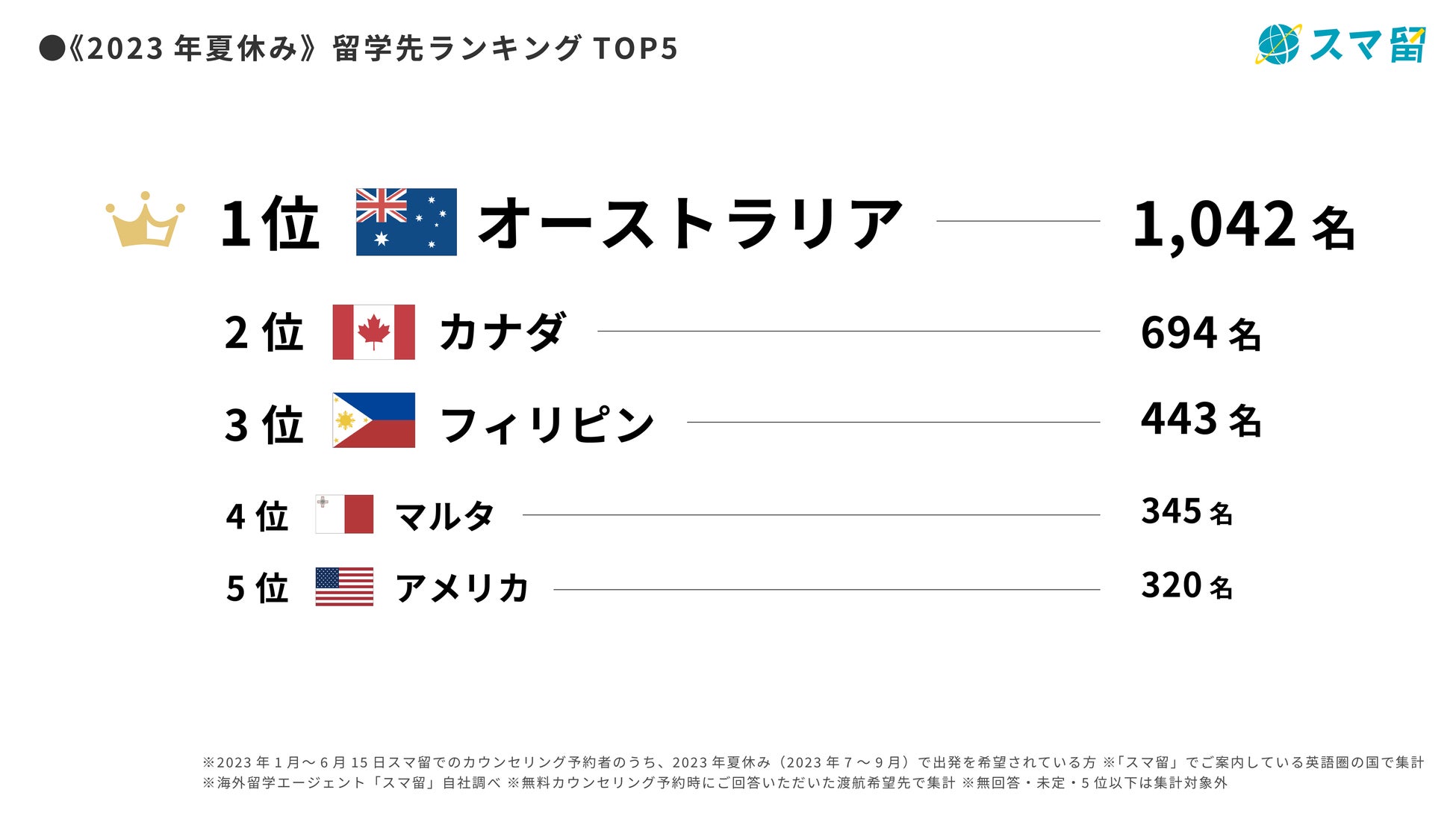 海外留学エージェント『スマ留』が2023年夏休みの留学先ランキングを発表。
