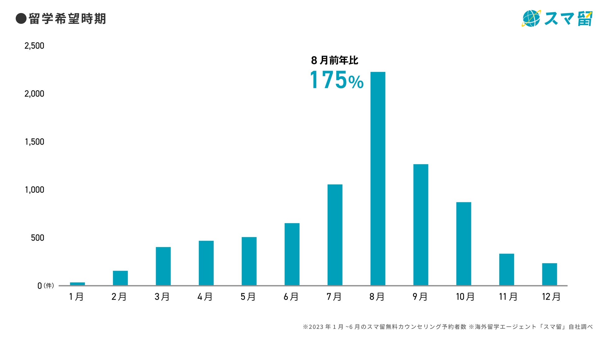 今回当社が実施した調査によると、2023年8月出発での留学希望者数※は前年同月比175%まで回復しました。各国の入国制限緩和や日本政府の水際対策の緩和により、コロナ禍で留学を我慢していた方が再度留学を検討する「リベンジ留学」の動きが引き続き見受けられています。