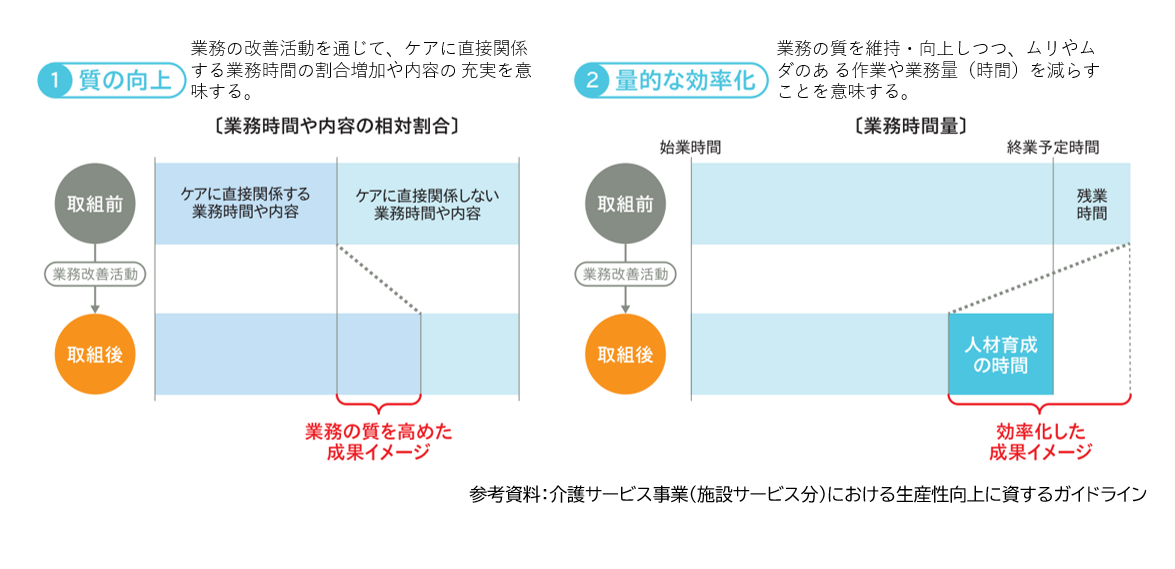 業務の負担改善を通じて、ケアに直接関係する業務時間の割合増加や内容の充実を図ることができ「サービスの質の向上」につなげます。