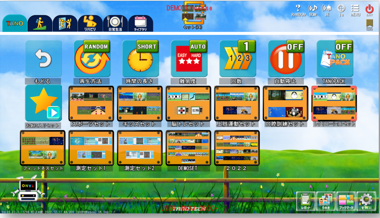 モーションセンサーの前に立つ(座る)だけで体の動きや音声が検知され、口頭では動きの説明が難しい自発的な動作を誘発することができるのがTANOの特徴となっており、180種類以上の運動・発声・脳活性化プログラムを非接触・非装着・非対面で実施する事が可能です。