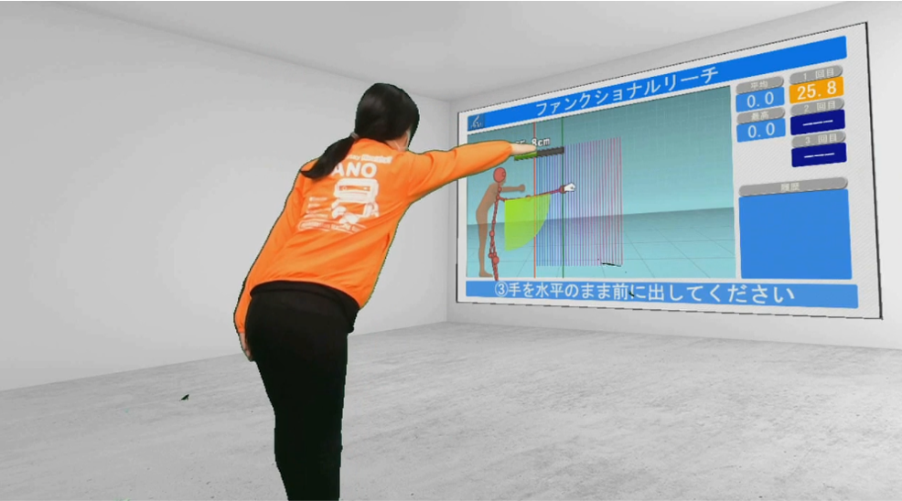 前方のセンサーに向かって、立った状態で、手を90°持ち上げ、その状態から体を前屈(手を前に伸ばしていく)します。必要な備品(メジャー等)・場所の設定等の準備、片付けの時間を削減することができ測定の効率化を図ることができます。