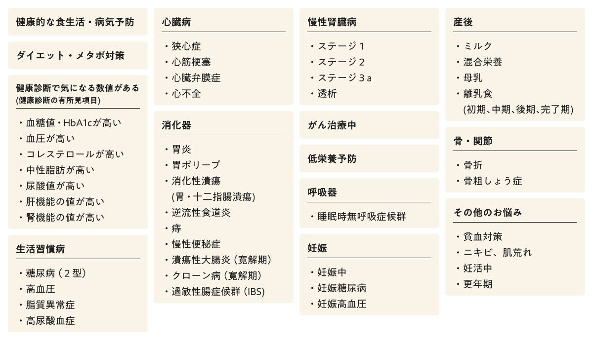 「誰もがいつまでもおいしく食べられるように」というビジョンのもとに、今回は睡眠時無呼吸症候群の他にも、腎機能の値が高い、更年期、骨粗しょう症の、骨折、胃ポリープの6病態をリリースいたします。青年期からシニアまで、途切れること無く食事管理のサービスを提供し、今後もサービスを拡大していきます。