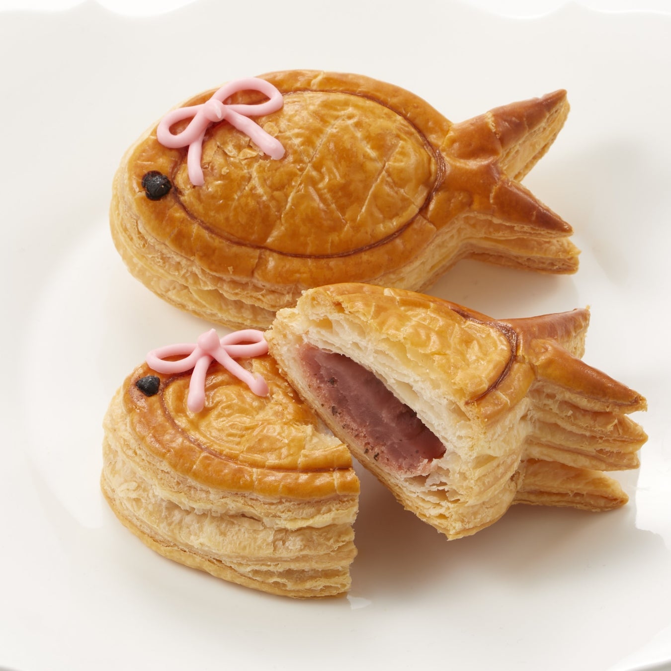 魚をモチーフにしたフランスの伝統菓子「ポワソン・ダヴリル」と日本の「たい焼き」から着想を得た、ベルン特製「フランス風さくらたい焼き」。和洋のテイスト、甘みと塩味を併せ持った深みのある味わいが特長。リボンをつけてプレゼントする本場のポワソン・ダヴリルのように、パータグラッセで描かれたピンクのリボンが印象的です。