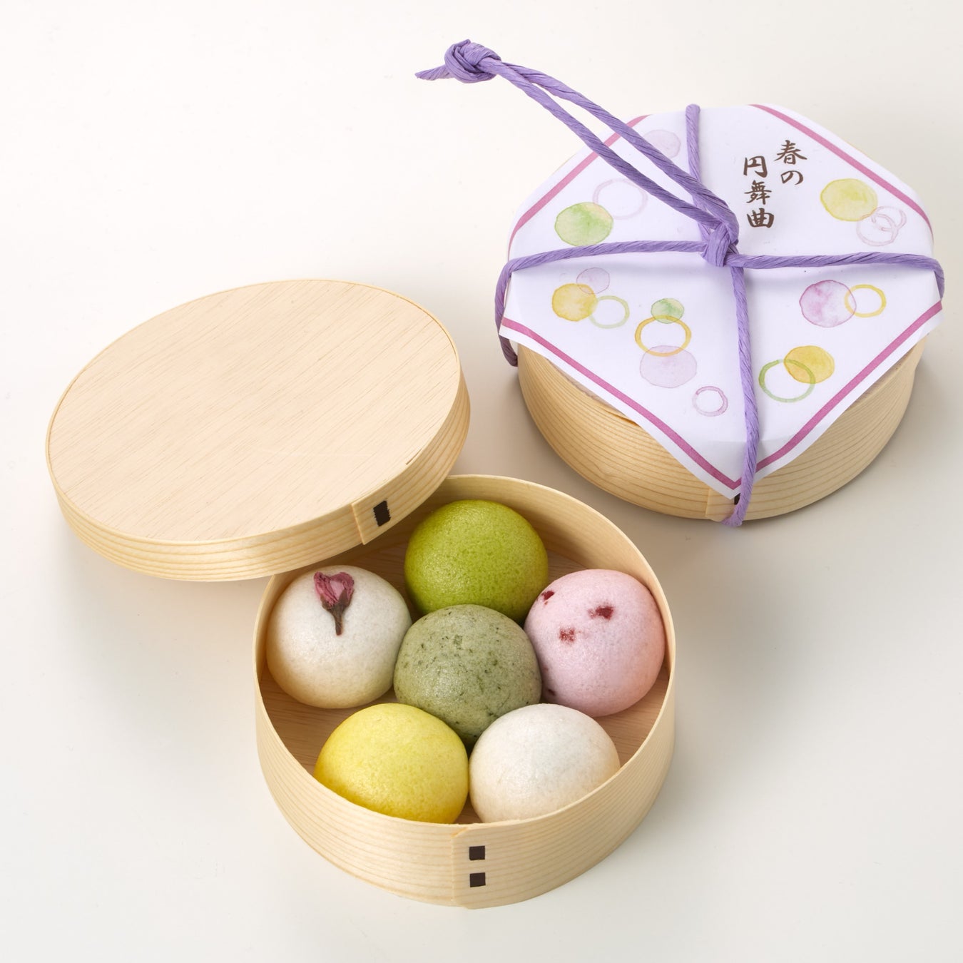 春らしいさくら餡、いちご餡、よもぎ餡、抹茶餡、黄身餡、小豆餡の6種類の薯蕷饅頭(じょうよまんじゅう)。淡い彩りの見た目や、季節感のあるやさしい味わいから、春を感じられます。わっぱに入っているので、手土産にもぴったりです。