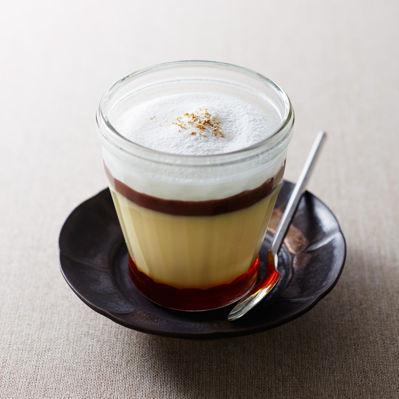 なめらかなカスタードプリンの下に、少しほろ苦いカラメルソースを仕込み、つぶあんゼリーを重ねたパフェ。ふんわりとクリームをのせた、金箔がきらめく一品です。味わいの変化を楽しみながら最後まで美味しくいただけます。
