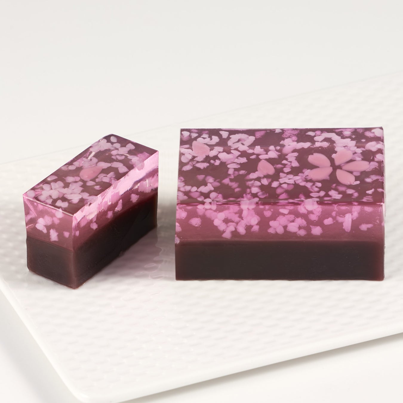 桜の花びらをかたどった羊羹を錦玉羹の中にちりばめ、小倉羊羹と二層にした棹菓子。粒状の道明寺で夜風に舞い散る桜が表現されています。