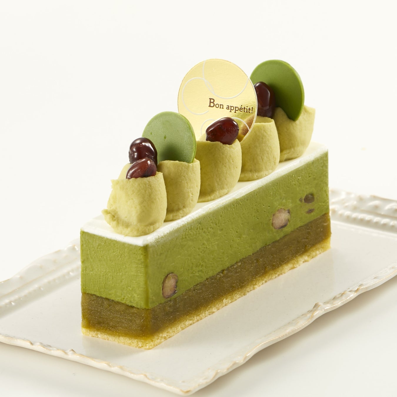 OSUYA GINZAのやさしい風味の信州りんご酢をたっぷりと生地に染み込ませたサバラン。抹茶プリンと桜餅餡、桜の生クリームを重ねた上に、桜いちご餡をトッピングした春らしいケーキです。