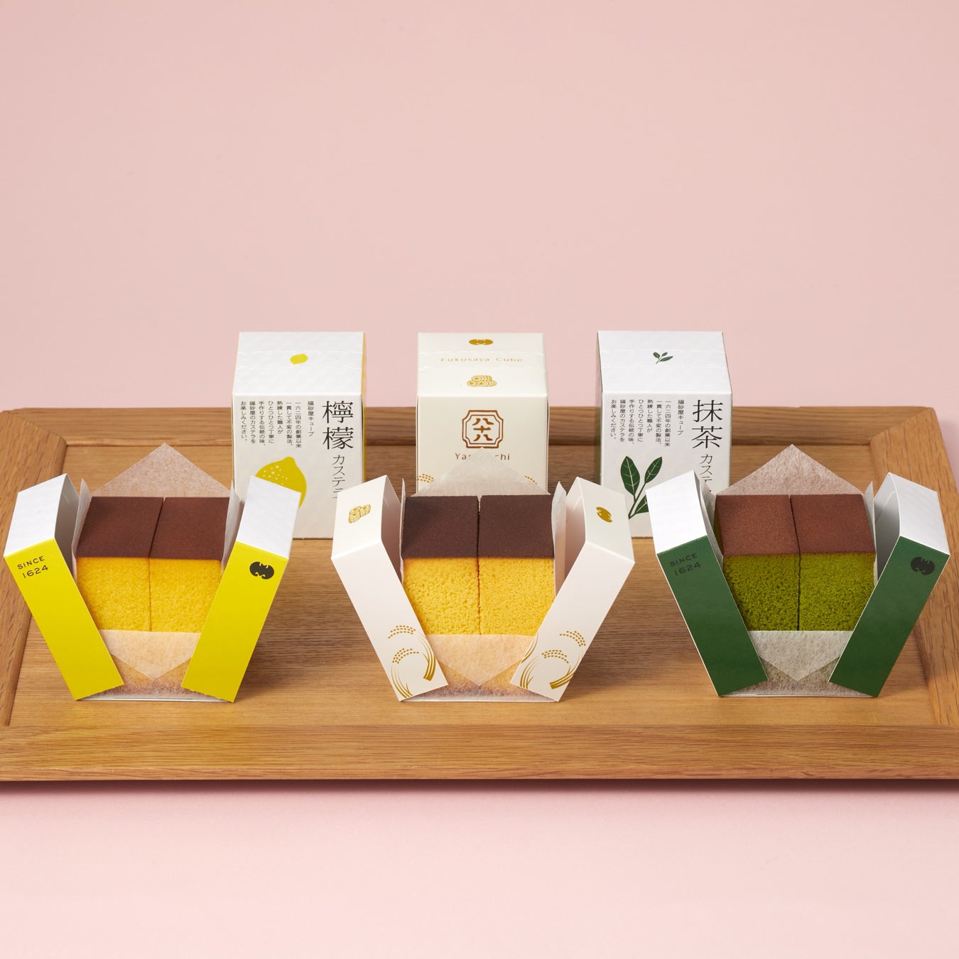 熟練した職人が、ひとつひとつ手づくりで焼き上げたカステラ二切れが入ったキューブ型の小箱。普段は手に入らない九州地区限定の檸檬と抹茶カステラ、東京限定の八十八カステラの3種のセットです。