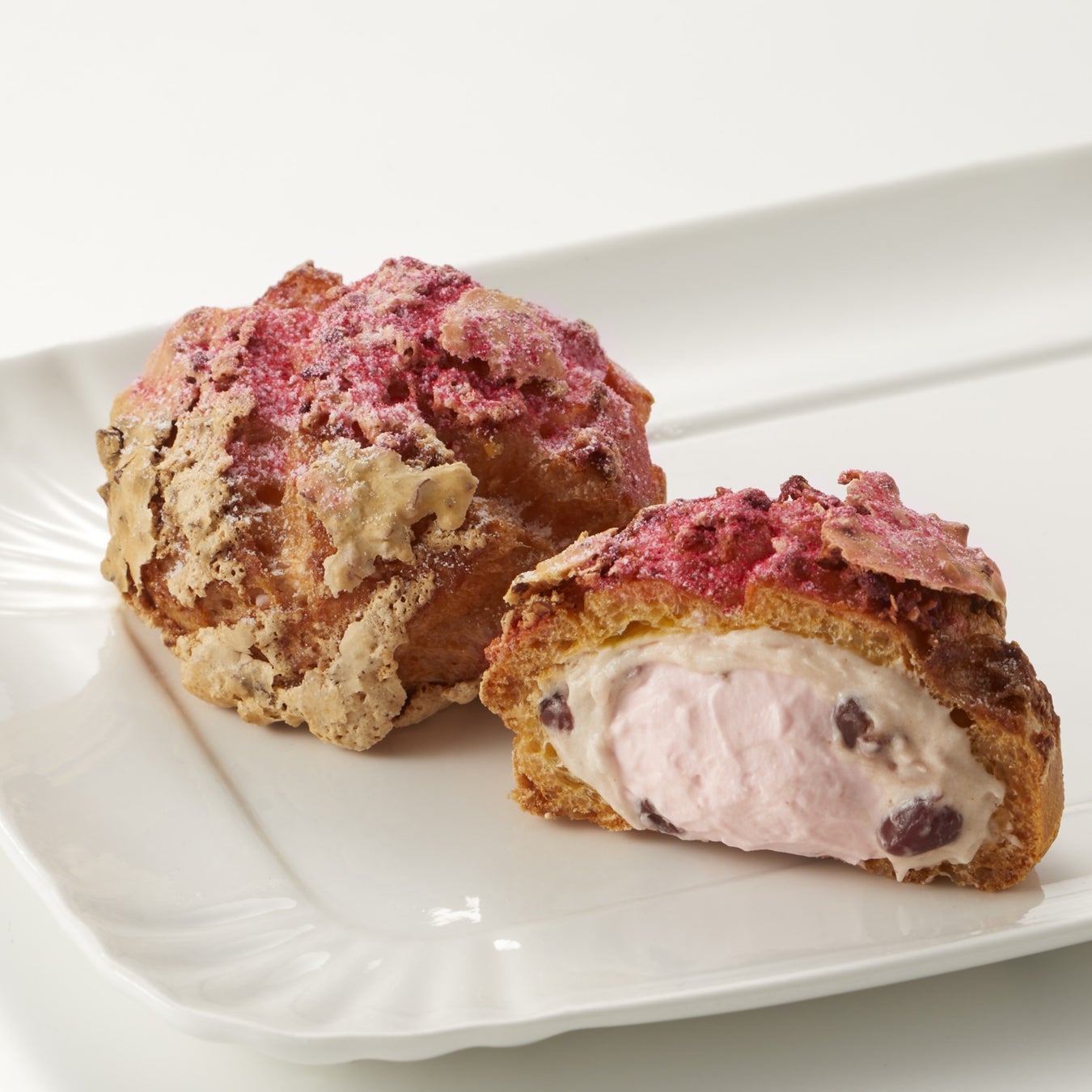 生地とクリームに能登半島珠洲産の塩を使用した、ザクザク食感のクロッカンシュークリーム。ほのかな塩味が優しく、甘味を引き立てる定番の塩カスタードと、北海道産小豆と桜餅餡を加えたクリーム、あまおうと桜の生クリームがたっぷりと入っています。