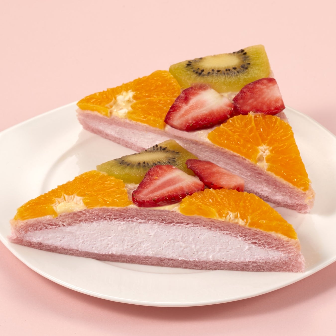 いちご、オレンジ、キウイフルーツをカラフルにトッピングした映えるオープンサンド。季節の桜食パンの間に桜風味のホイップがサンドされた、ピンク色がキュートな限定商品です。