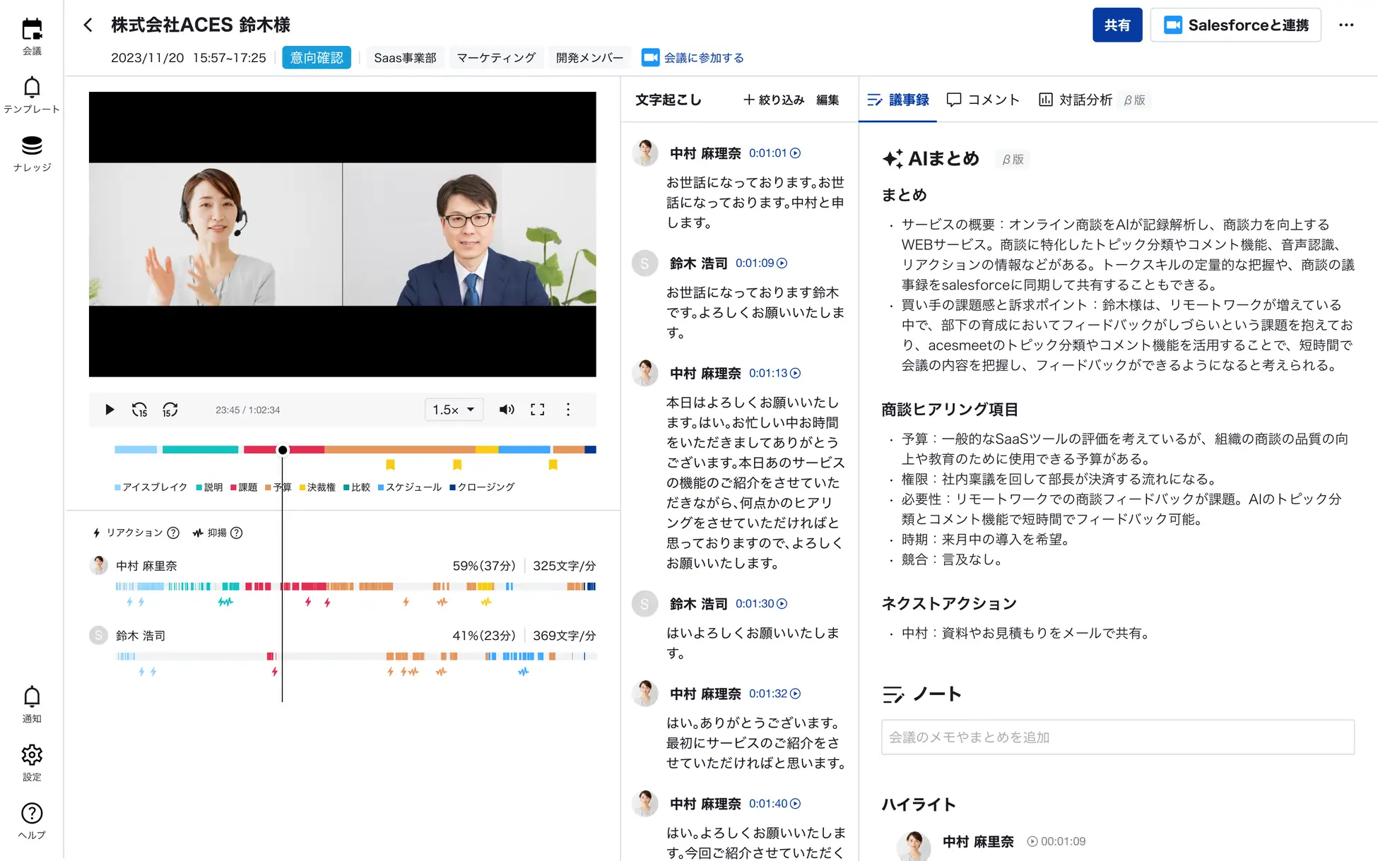 ACESは、オンライン会議を録画し、独自AIによる話者ごとの自動書き起こしや重要なシーンの可視化を行うことで、オンライン商談における成約率の向上と現場の工数削減に寄与する営業支援AIツール「ACES Meet」を幅広い業界のお客様にご提供しております。