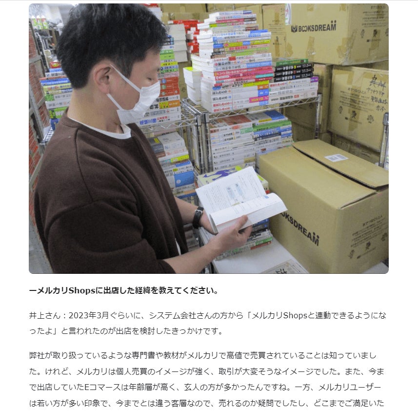 株式会社ブックスドリーム(本社:大阪府大阪市、代表取締役:井上聖也)は、参考書・専門書・医学書・大学の教科書・赤本・予備校テキスト・教材を専門に買取・販売しており、販売についてはこれまでは主に「Amazonマーケットプレイス」や「ヤフーオークション」「ヤフーショッピング」で行ってきましたが、2023年に「メルカリ」でも販売を開始。大変ご好評をいただき、2025年12月で出店2年半を迎え、18万評価と4万5千フォロワーを獲得、出品数も30万点以上になりました。