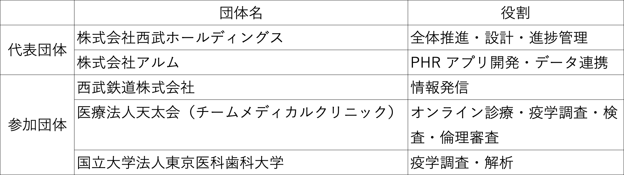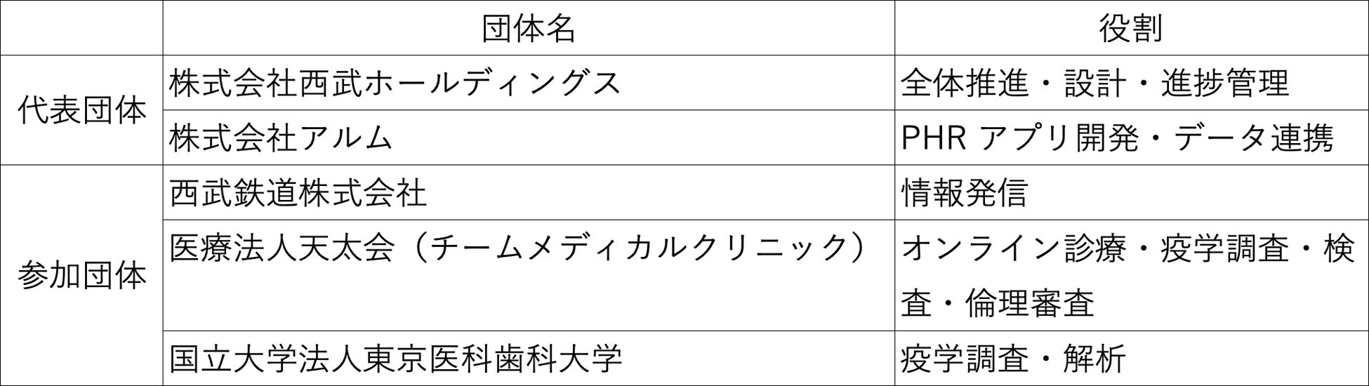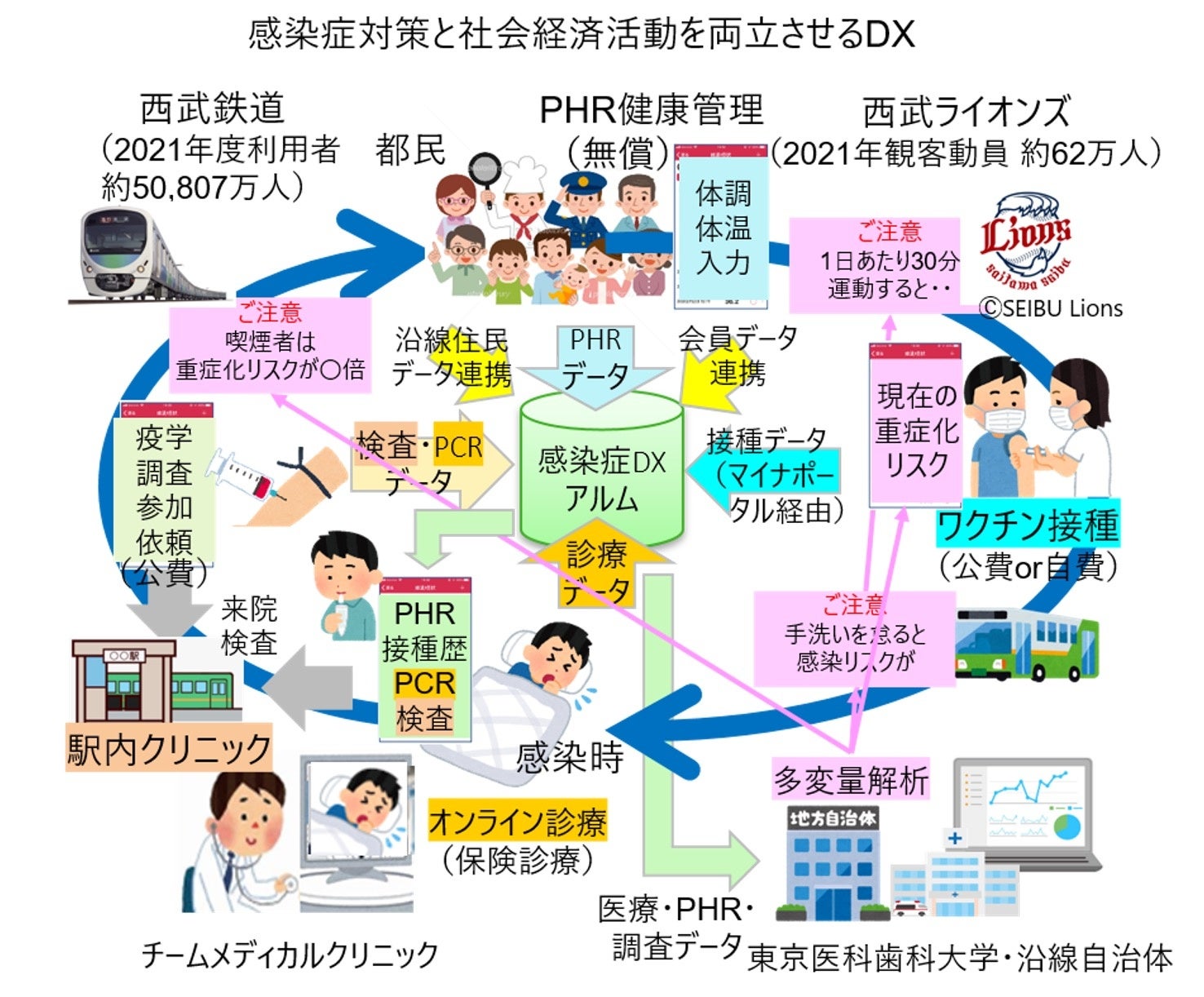 新型コロナウイルスは長期化の様相が色濃く、感染症対策と社会活動の両立は喫緊の課題です。この度、西武HDとアルムが代表団体として、西武鉄道株式会社、アルムがIT化を支援する医療法人社団天太会(チームメディカルクリニック、以下「天太会」)、ならびに国立大学法人 東京医科歯科大学が参加団体として、ご高齢の方や障がいをお持ちの方をはじめ、東京都にお住まいのすべての方※2を対象とした、ウイルス特性や免疫状態にあわせた生活様式や社会活動の在り方を実証するとともに、正しい情報・対策を発信し理解を得ることを目的とした事業(以下「本事業」)を提案し、今般の採択にいたりました。