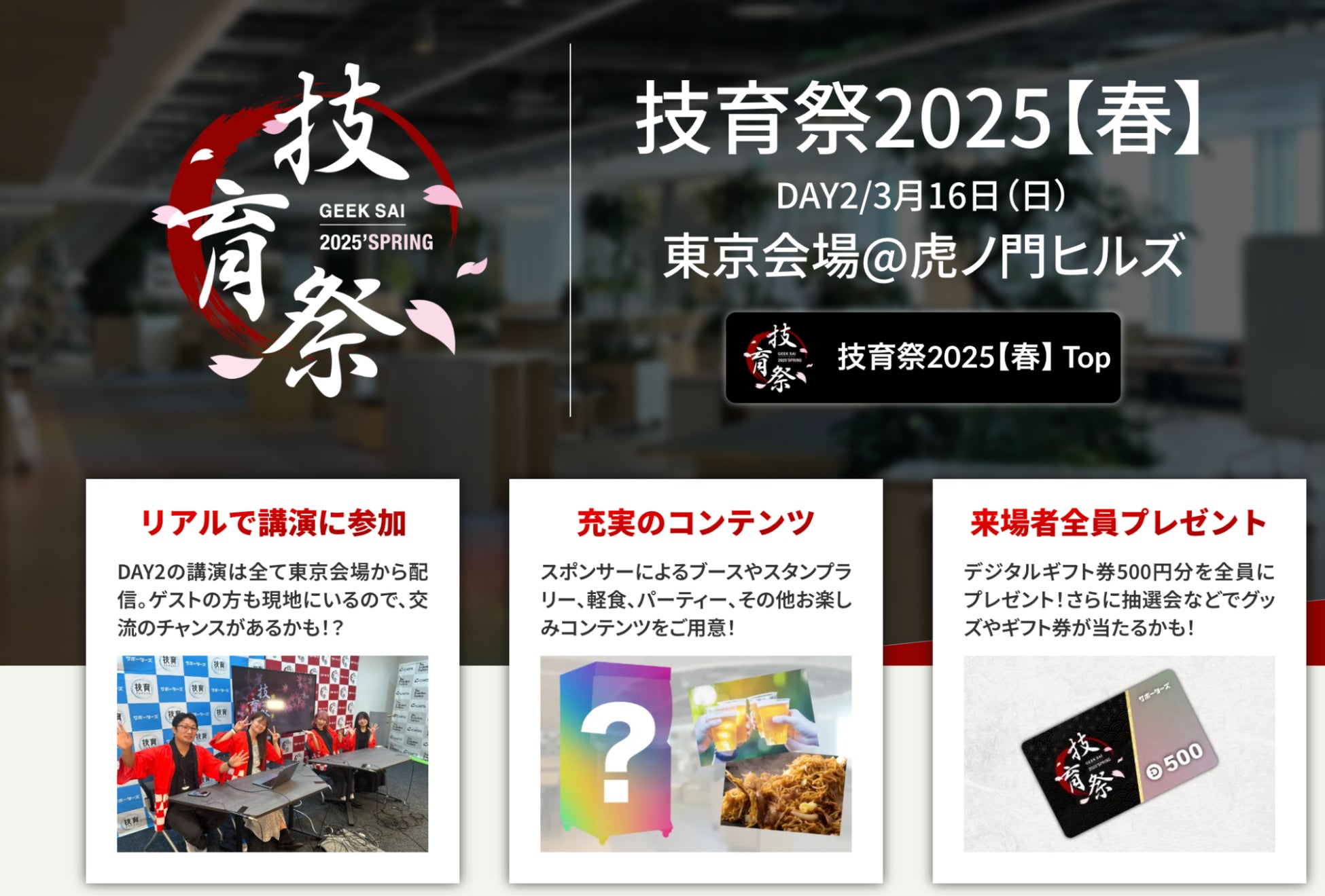 過去には、元2ちゃんねる管理人のひろゆき氏、データ科学者の成田悠輔氏、Ruby開発者のまつもとゆきひろ氏などがご登壇されました。技育祭2日目にあたる3月16日(日)のオフライン開催(東京会場)では、対面でゲストの講演を聴くことができるほか、スポンサーによるブースや軽食、パーティーなどのお楽しみコンテンツ、来場者全員を対象としたデジタルギフト500円分のプレゼントをご用意しています。