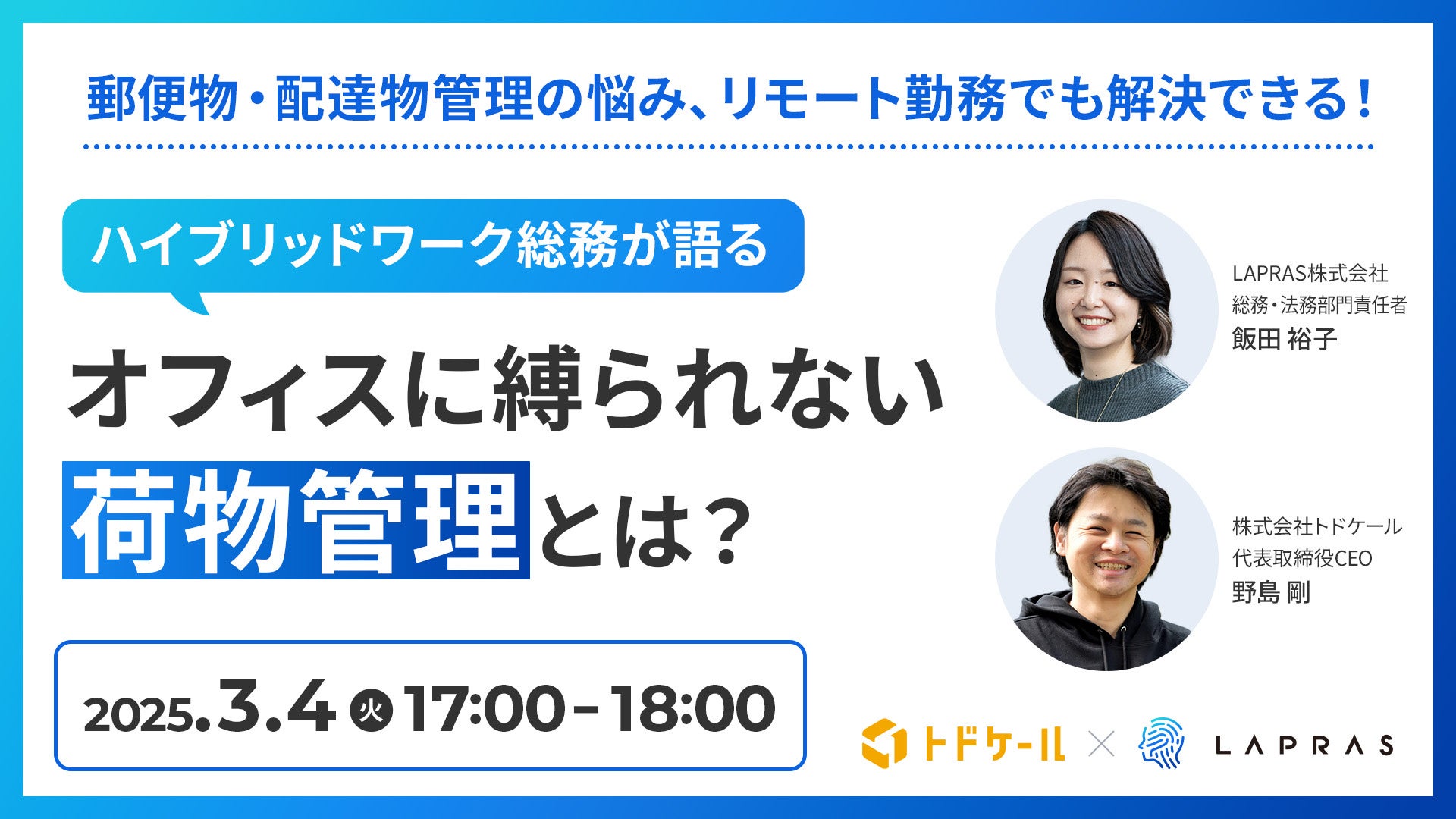 株式会社トドケール(本社:東京都千代⽥区、代表取締役:野島剛、以下トドケール)は、LAPRAS株式会社(所在地:東京都渋谷区、代表取締役:染谷健太郎 以下、LAPRAS社)と共催で、2025年3月4日(火)17:00より、オンラインセミナー「ハイブリッドワーク・フルリモート環境でも“郵便・配送”に困らない! ~LAPRAS社に聞く、クラウドメール室のリアル活用事例~」を開催いたします。本イベントはどなたでも参加が可能です。