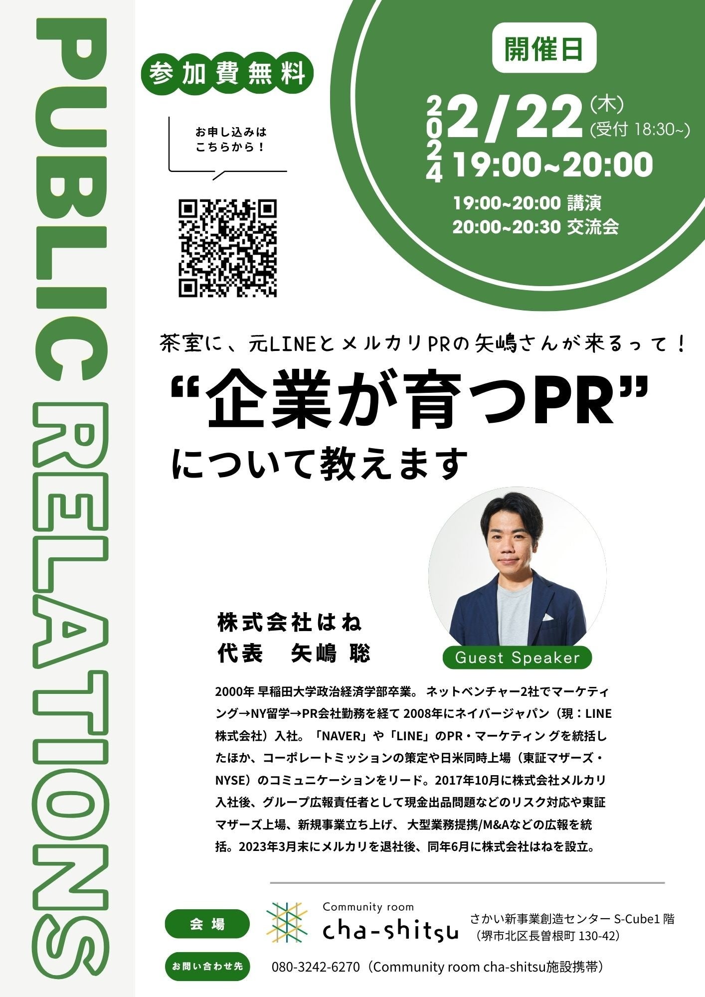 ソーシャルコワーキングスタートアップの株式会社ATOMica(本社:宮崎県宮崎市、代表取締役:嶋田 瑞生、南原 一輝、以下ATOMica)は、堺市なかもずにあるインキュベーション施設S-Cube内のイノベーション交流拠点「Community room cha-shitsu」で、2024年2月22日(木)に、元LINEとメルカリで広報/PRを担当、統括してきた株式会社はねの代表 矢嶋聡氏をゲストスピーカーにお迎えして、『“企業が育つPR”について教えます』を開催いたします。