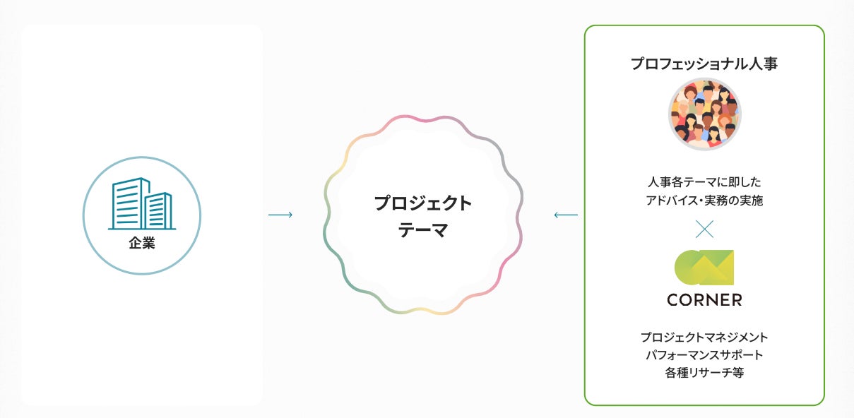 企業の人事領域の業務は、採用、労務、制度設計、組織・人材開発、人的資本の情報開示やDE&I推進など多岐に渡り、業種・組織規模・社員構成・事業フェーズ・組織風土など企業ごとのニーズが異なるため、個別多様な課題が存在します。CORNERに登録しているパラレルワーカーのスキル・知見・多様性があるからこそ、企業ごとの組織課題に対して柔軟な解決策の提示が可能になります。また、HR系・人事出身者であるCORNERのコンサルタントがパラレルワーカー・企業と双方向で対話しながら、プロジェクト全体のPDCAを伴走するため、よりサクセスに繋がりやすいのも特徴です。