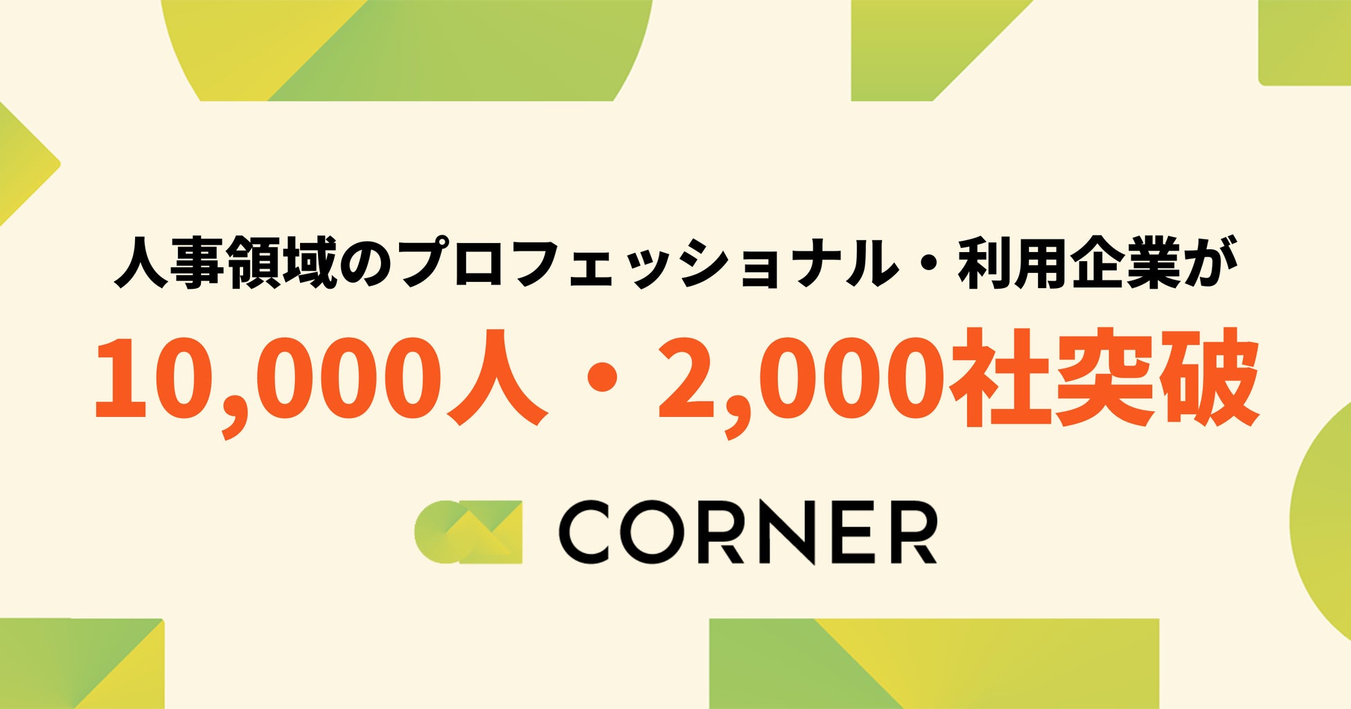 株式会社コーナー(所在地:東京都渋谷区 代表取締役:門馬 貴裕、以下コーナー)が運営する、人事プロフェッショナルブティック「CORNER」に登録している人事領域のプロフェッショナルが10,000人を突破いたしました。(2025年1月時点)