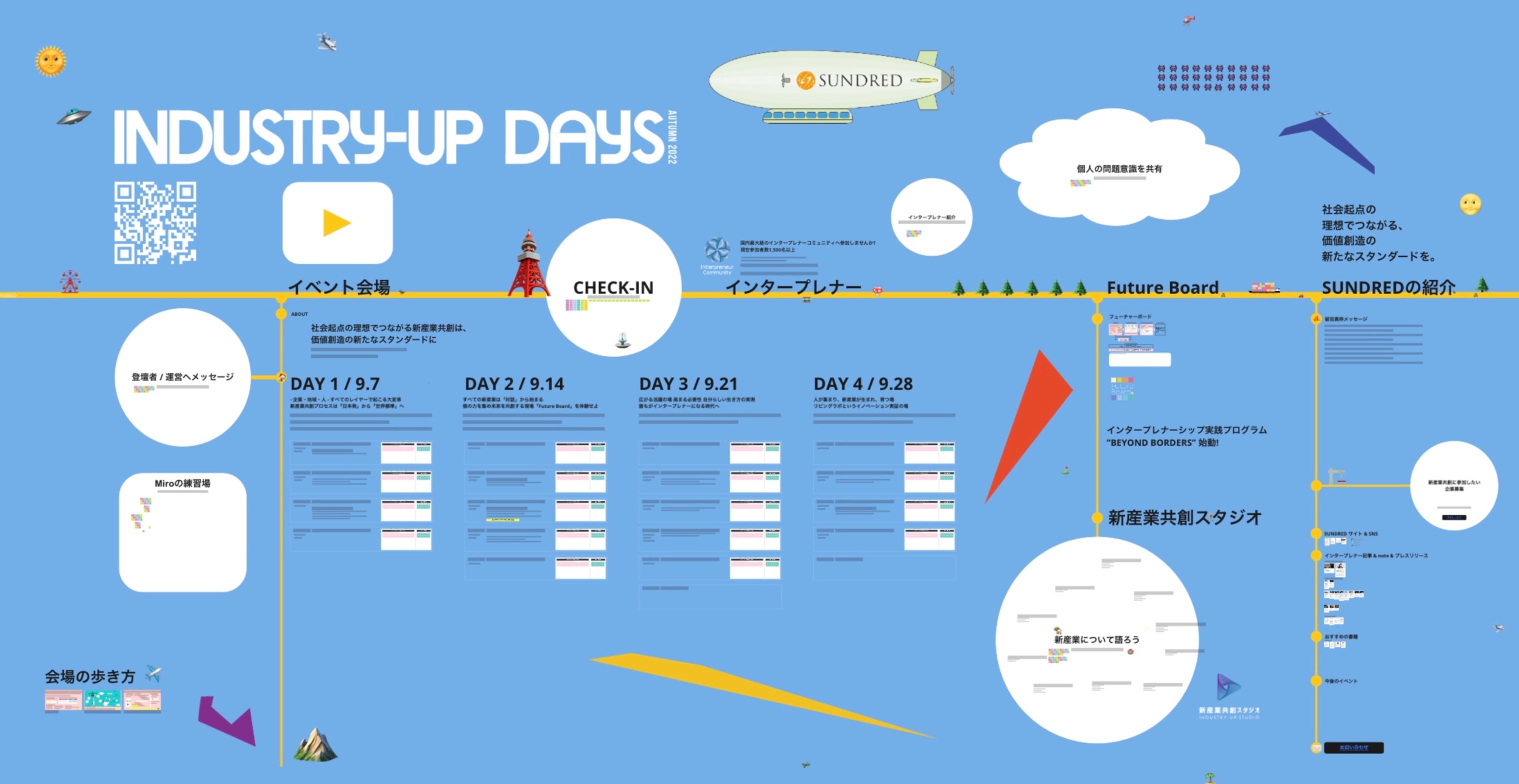 100個の新産業の共創を目指す「新産業アクセラレーター」SUNDRED株式会社(所在地:東京都渋谷区、代表取締役:留目 真伸、以下:SUNDRED)は、2022年9月7日(水)、14日(水)、21日(水)、28日(水)の4日間に渡り開催する国内最大級の新産業共創のための交流の場・越境人材の祭典「Industry-Up Days Autumn 2022」に先行して、オンライン交流会場(Miro会場)がオープンしたことをお知らせします。これによってイベントの開催前から開催中、開催後も参加者同士、または登壇者同士での交流が可能になります。