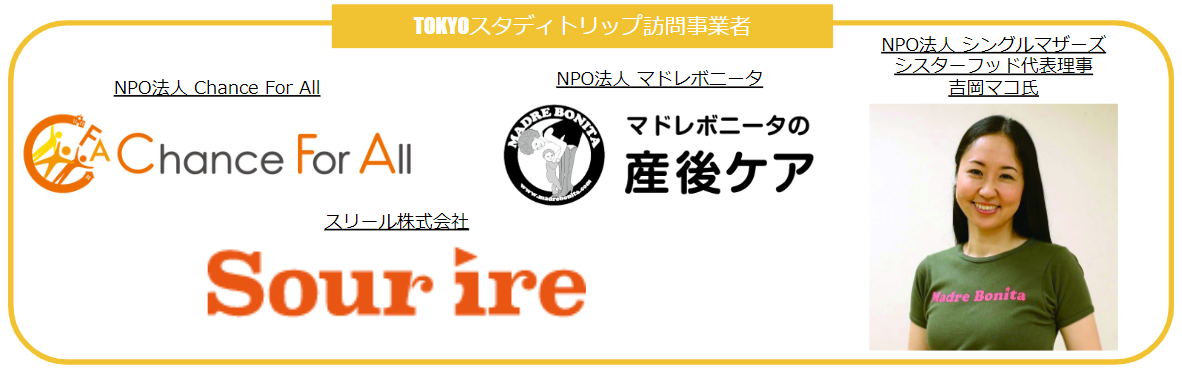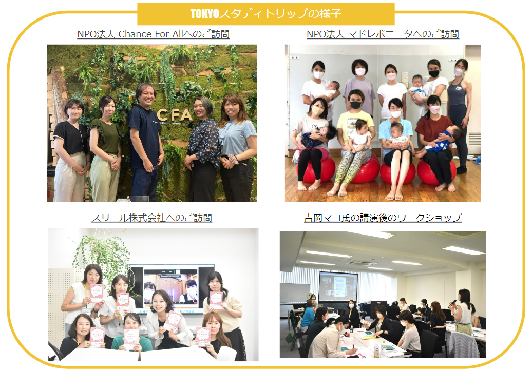 『TOKYOスタディトリップ』は、長年に渡り社会課題・女性活躍推進支援に向き合う東京の企業・団体を訪問する1泊2日の取組みであり、1日目は NPO法人 Chance For All/スリール株式会社/NPO法人 マドレボニータへ訪問、2日目は 吉岡マコ氏(NPO法人 シングルマザーズシスターフッド代表理事)の講演会とワークショップを開催しました。