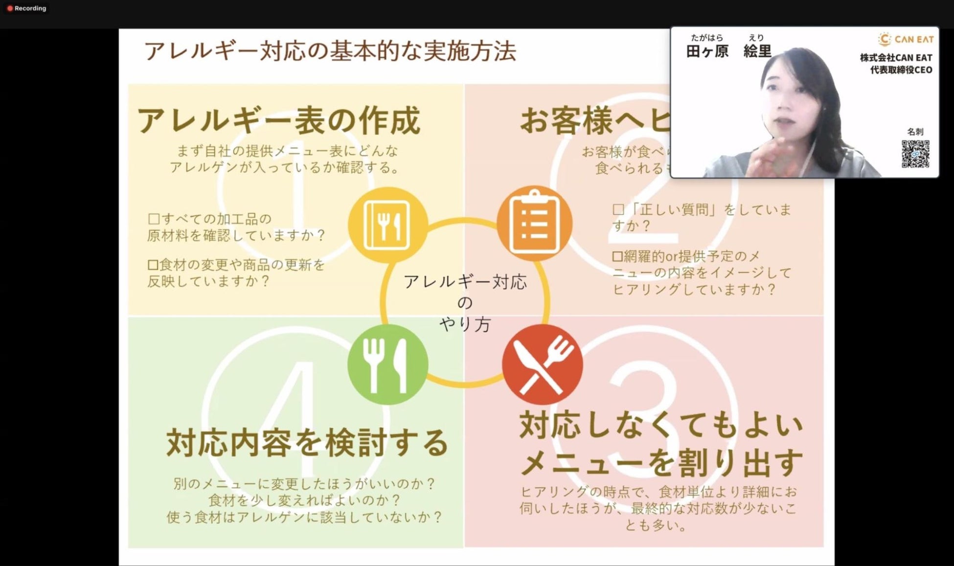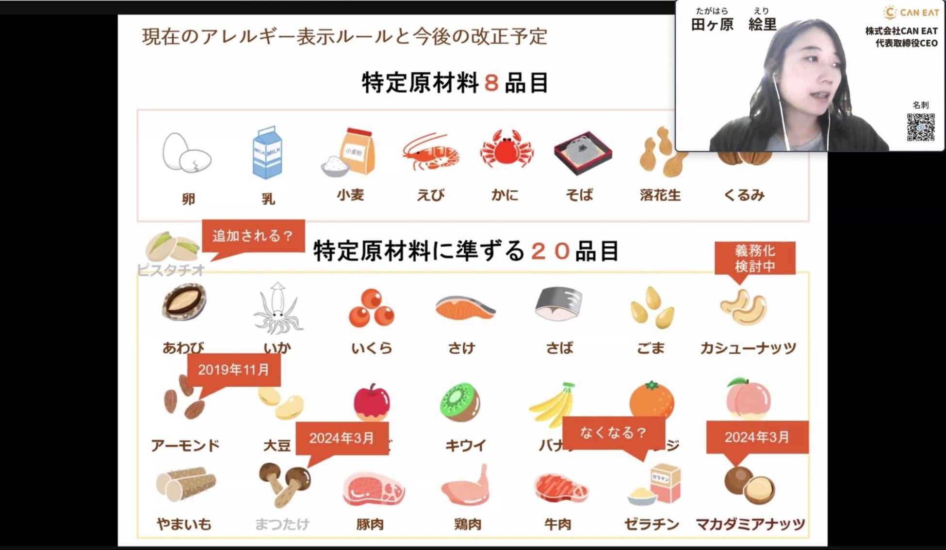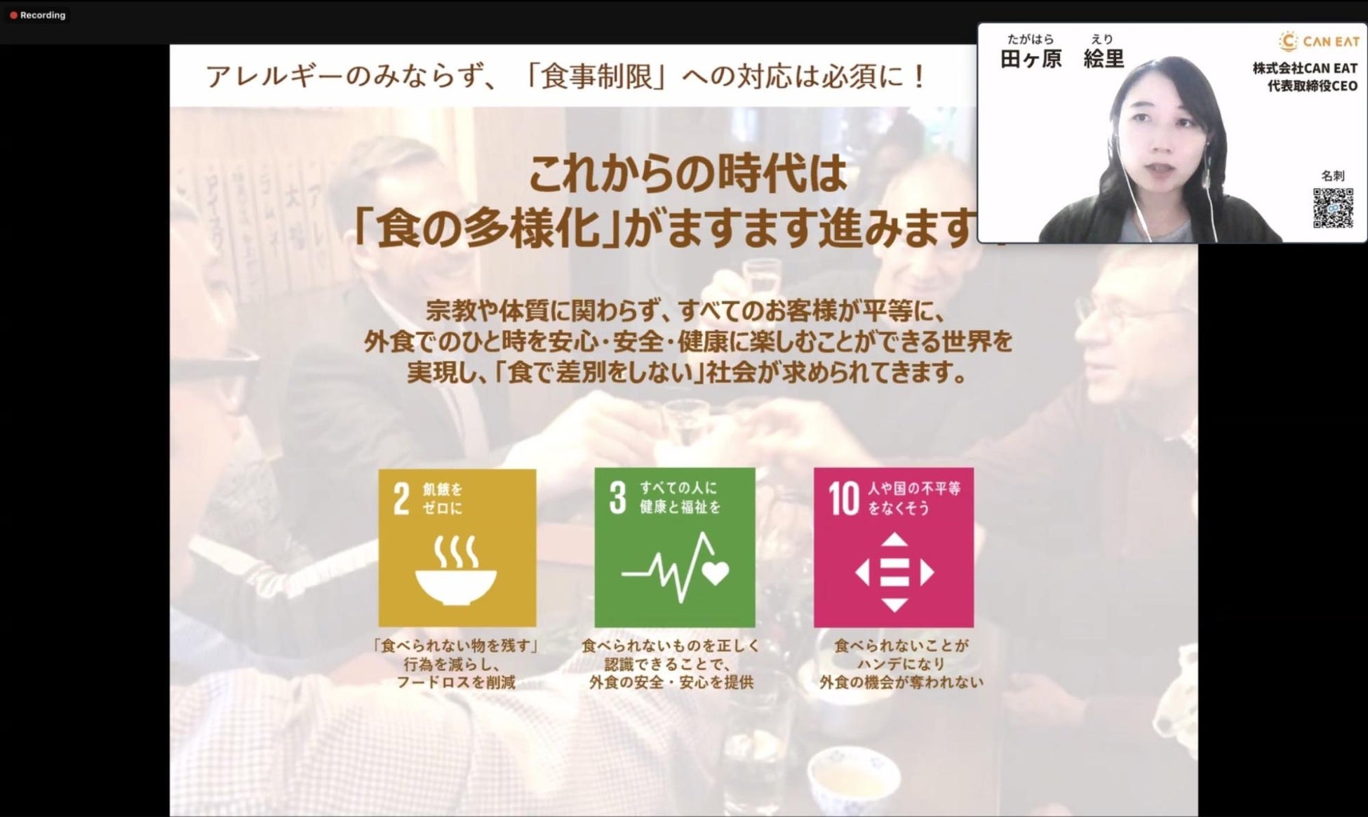セミナーの終盤では、食物アレルギーのみならず、思想・信条や妊娠・授乳といったさまざまな理由で「食べられないもの」がある人が増加している現状にも言及し、食の多様化が進むなかですべての人が心置きなく外食を楽しめる環境を整えることの意義や市場性についてお話ししました。