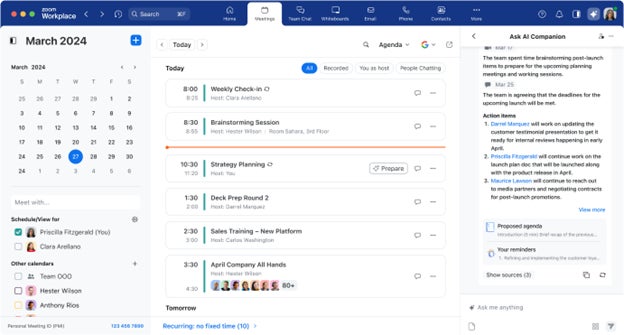 2024 年 3 月 25 日 米フロリダ州オーランド— 本日、Zoom Video Communications, Inc.(NASDAQ:ZM)は、チームワークを再構築する、AI 駆動型のオープンなコラボレーション プラットフォームである Zoom Workplace、そして AI Companion の新しい拡張機能を発表しました。Zoom の最新の製品と機能には Zoom Phone 向けの AI Companion 新機能、Ask AI Companion の拡張機能、Zoom アプリの新デザインなどが含まれており、ユーザーはよりモダンな働き方の促進に必要なオールインワン プラットフォームとして利用することができます。また、 Zoom Contact Center についてもカスタマー エクスペリエンスの強化を発表しました。これにより、企業は顧客との関係性を強化し、 AI を用いたリアルタイムのインサイトを活用することで、即時のエージェント対応を向上させることができます。
