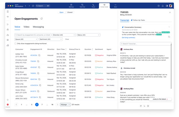 Zoom Contact Center では、AI Companion for Contact Center が追加料金なしで利用できます。AI Expert Assist のさらなるリアルタイム機能としては、ナレッジ ベース、顧客関係管理(CRM)システム、その他レコード システムから最適な回答を検索し、提案する機能が含まれます。またスーパーバイザーの皆さまは、1 つのダッシュボードから、リアルタイムの顧客の感情、ライブ書き起こし、および会話の要約を使用して、エージェントのリアルタイムのエンゲージメントを可視化できるようになり、エージェントを適切に管理し、サポートが必要なタイミングを簡単に特定できるようになりました。