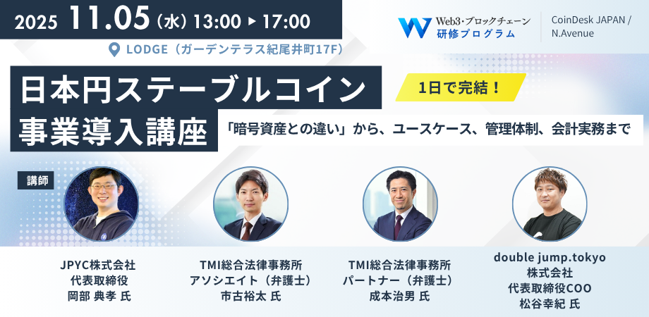 「1日で完結!日本円ステーブルコイン事業導入講座 〜「暗号資産との違い」から、ユースケース、管理体制、会計実務まで〜」を、11月5日開催。JPYC代表 × 金融庁出身弁護士 × Web3実務者が登壇!