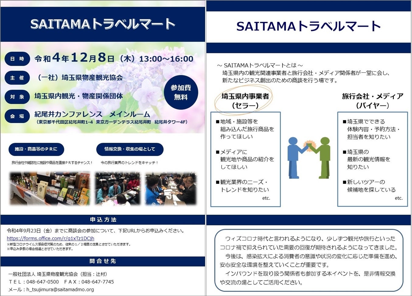 (一社)埼玉県物産観光協会は、県内の観光施設、飲食・宿泊施設、市町村及び観光協会担当者(セラー)と、旅行会社(バイヤー)及びメディア(海外、国内)との交流の機会を設け、観光旅行に関する情報交換や事業・ビジネスの拡大の場を創出することにより、施設・観光地の旅行商品化を促進し、観光客の誘致を図るため、令和4年12月8日に旅行会社等と観光事業者をマッチングする「SAITAMAトラベルマート」を開催いたします。