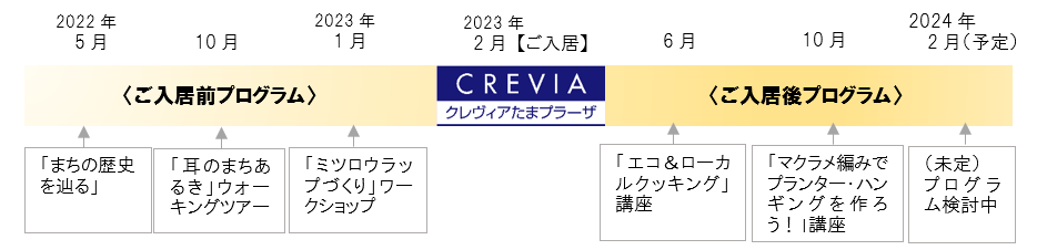 マンションの立地や環境に合わせて、地域の活動や施設とコラボレーションし、アートや食、防災、子育てなど、様々なテーマのコミュニティプログラムを企画。ご入居前からご入居後まで、継続的にプログラムを実施し、楽しく学びながら街への愛着を育み、入居者同士や地域の方とのつながりをサポートする取り組みです。