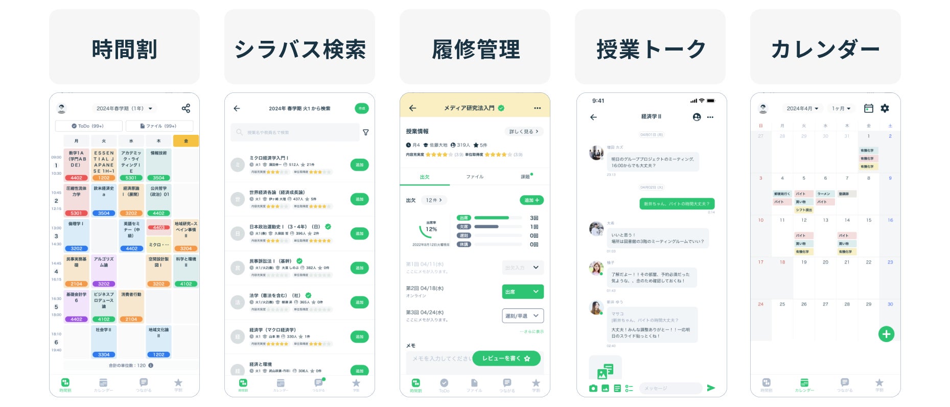 出欠状況、課題の締め切りや授業ノートを管理できます。