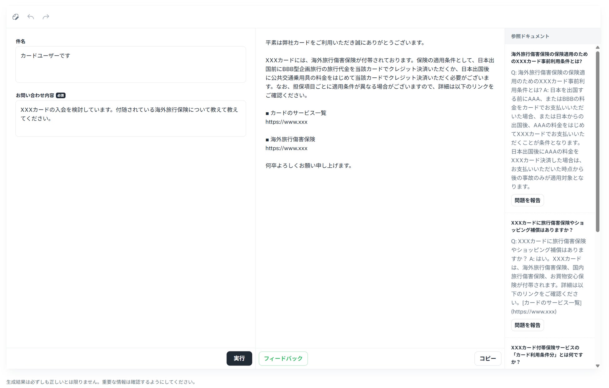 本取り組みは、三井住友カードのコンタクトセンターに寄せられるお問い合わせに対し、ELYZAが提供する検索拡張生成(RAG)(※1)技術を活用して社内データを検索(探索AI)し、回答の草案を自動で生成(回答生成AI)するものです。2024年6月末より三井住友カードが運営するコンタクトセンターのメール回答業務から利用を開始いただいておりました。(※2)