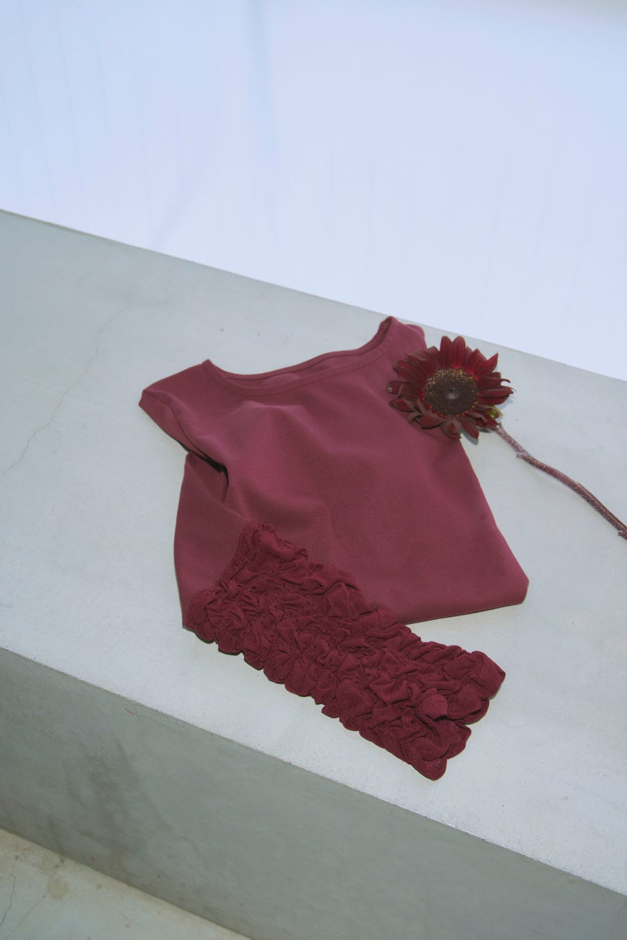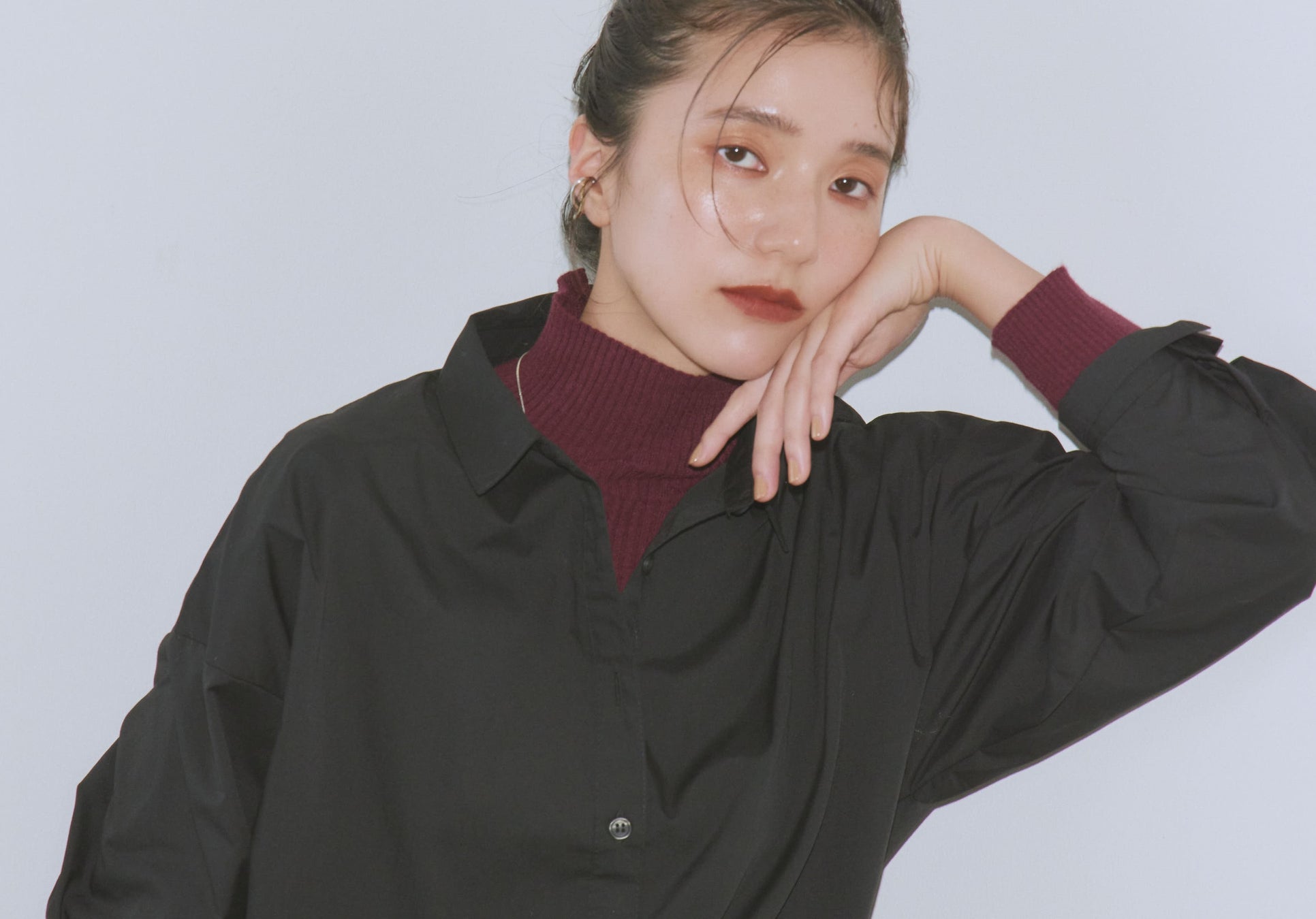 インナーとして差し色にも、1枚で主役にもなるボルドーで、カジュアルさと上品さを共存させております。