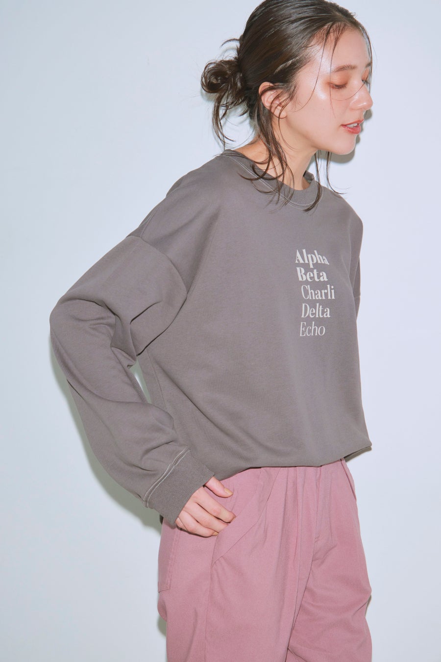 厚みのあるラバープリントと、ステッチとリンクさせた派手過ぎないニュアンス感のある配色がポイントです。裾リブ仕様の腰で止まる丈感で、ゆるっとラフな着こなしができます。