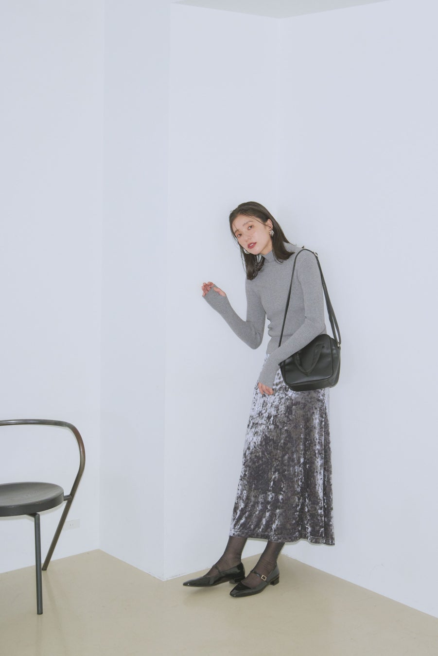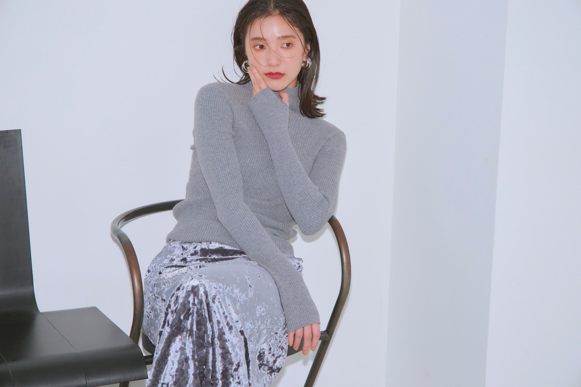 大人でも取り入れやすいダークシルバーのメタリックスカートは、程よい光沢感で都会的かつスタイリッシュに。